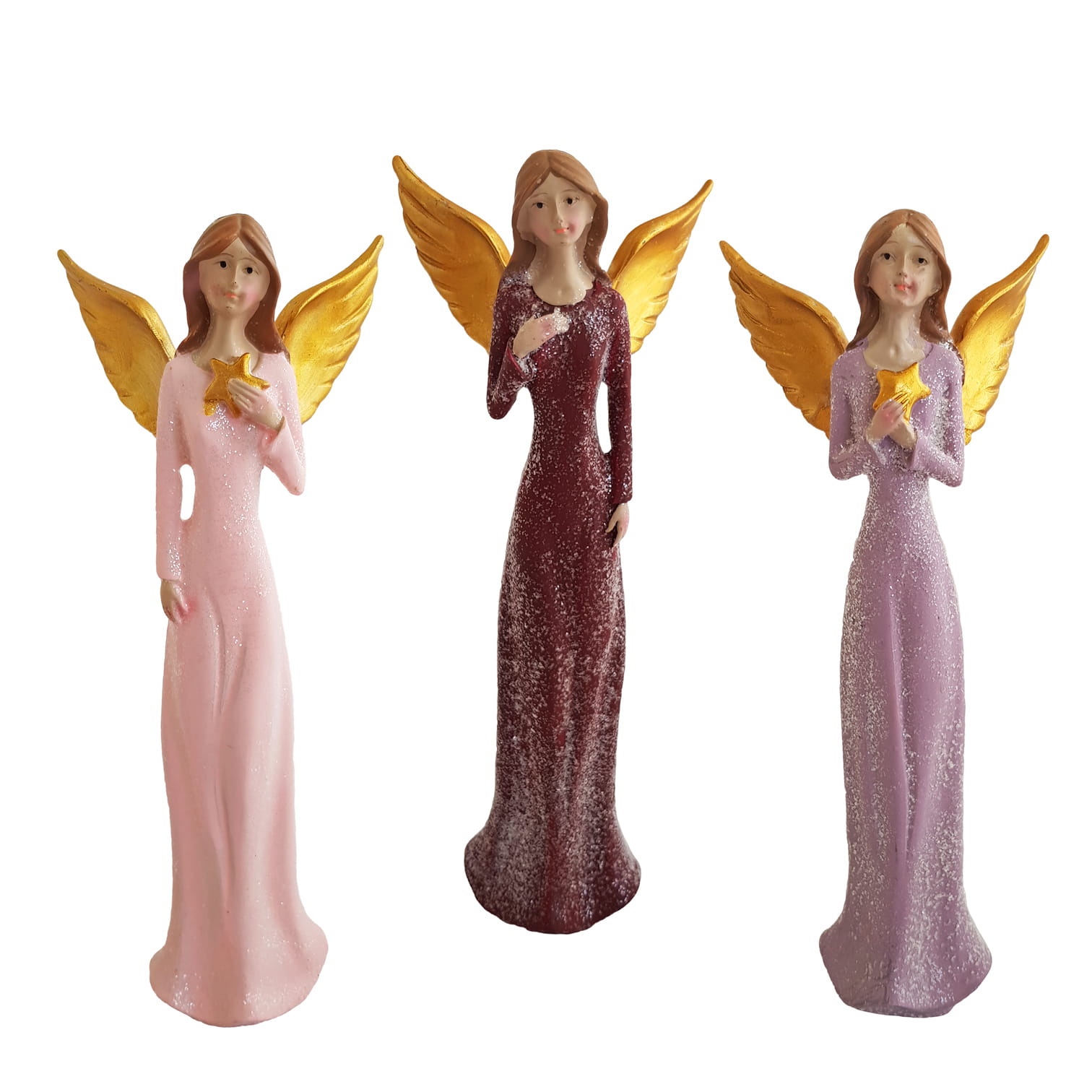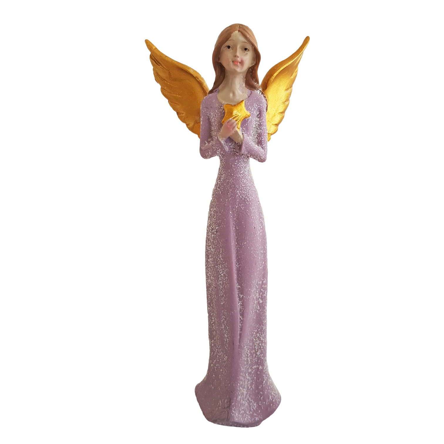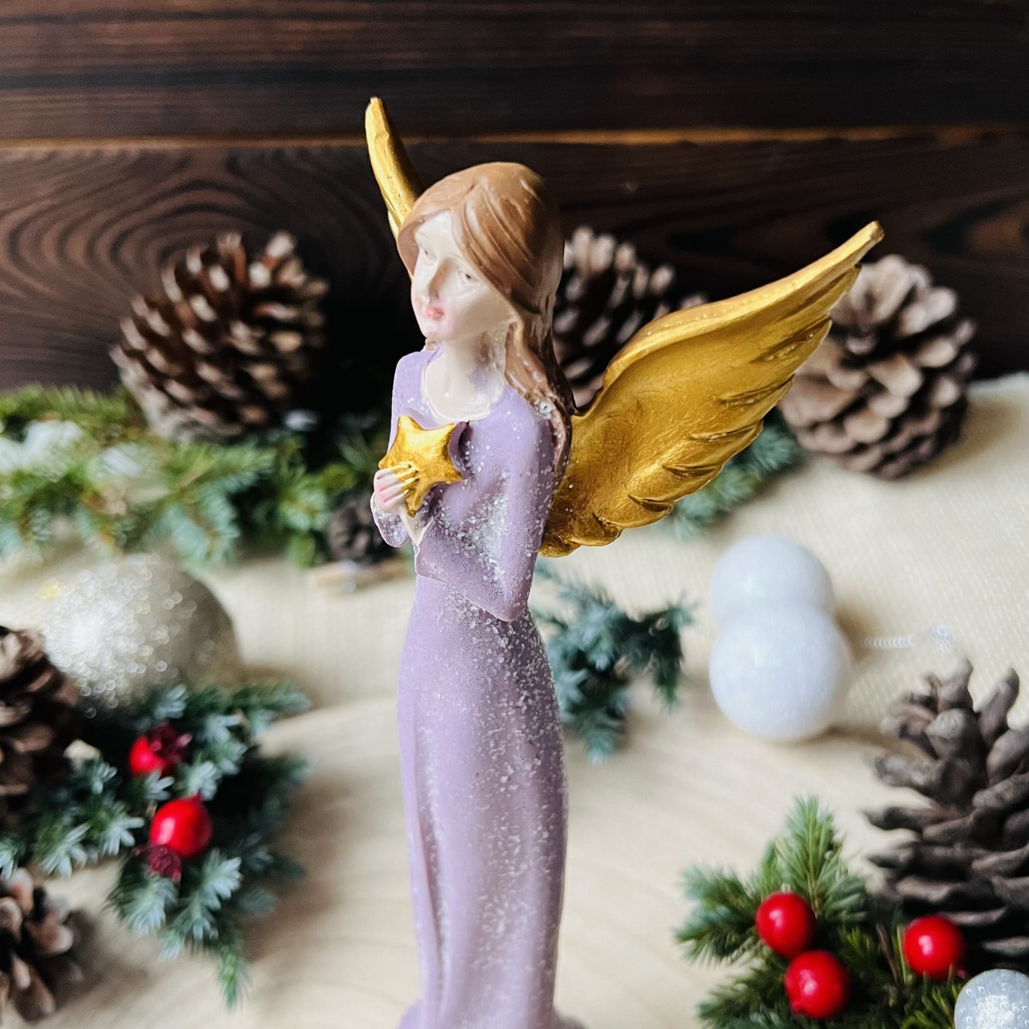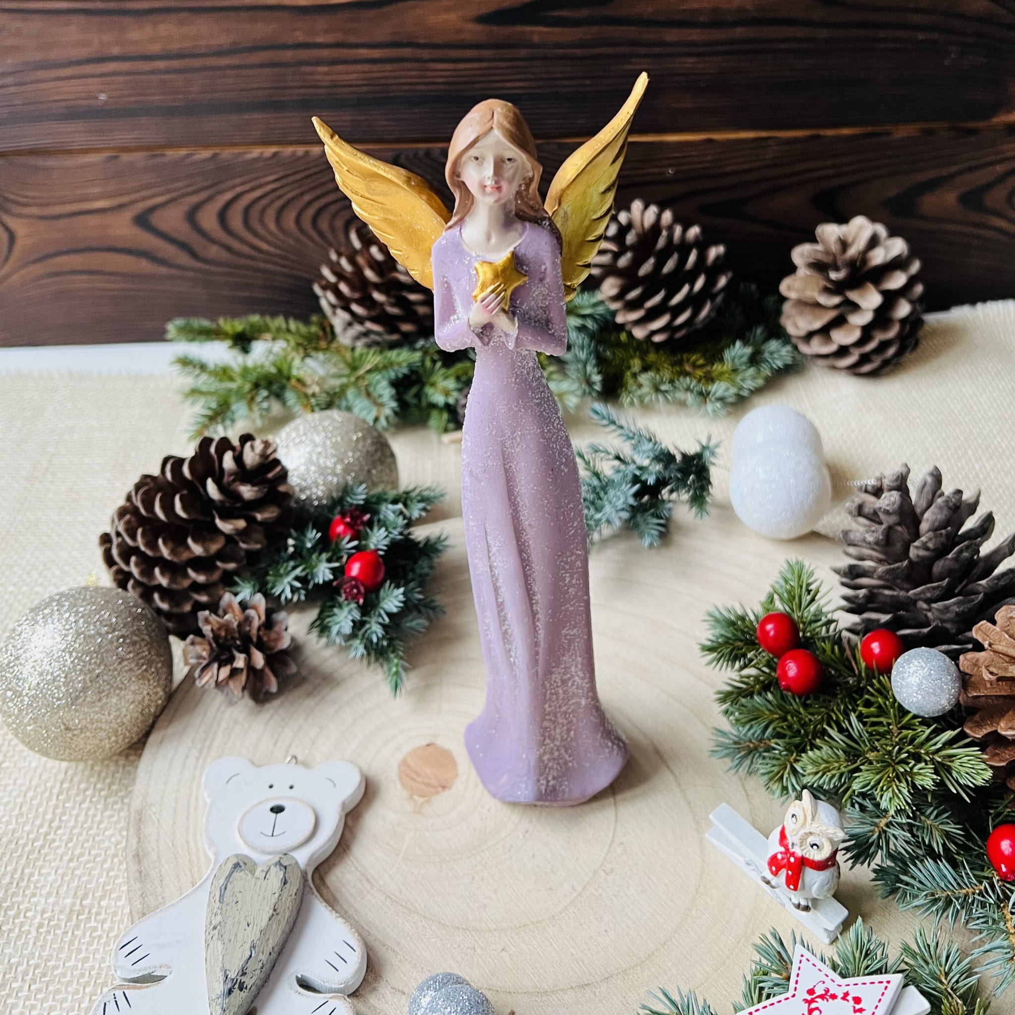 Anioł w fioletowej połyskującej sukience, piękna dekoracja.