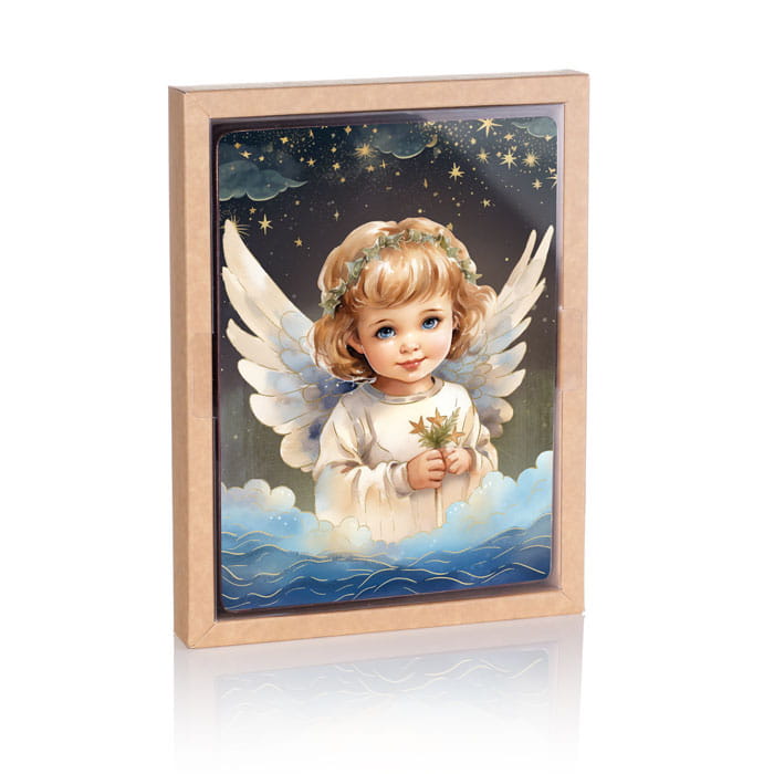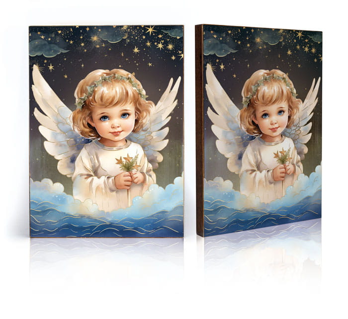 Na prezentowanej ikonie religijnej znajduje się wizerunek cudownego Aniołka. Ikona wywołuje miłe odczucia i będzie wspaniałym upominkiem dla dziecka.