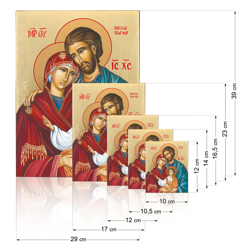 Ikona religijna dostępna w siedmiu rozmiarach – 10x12cm, 10,5x14cm, 12x16cm, 17x23cm, 29x39cm, 50x70cm oraz 70x100cm.