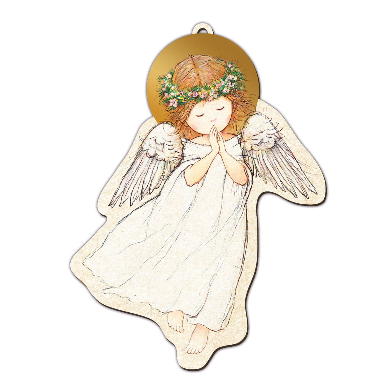 Obrazek drewniany w kształcie aniołka. Produkt charakteryzuje się wyjątkową grafiką. Jest to idealna forma upominku z okazji uroczystości Pierwszej Komunii Świętej, Chrztu Świętego.