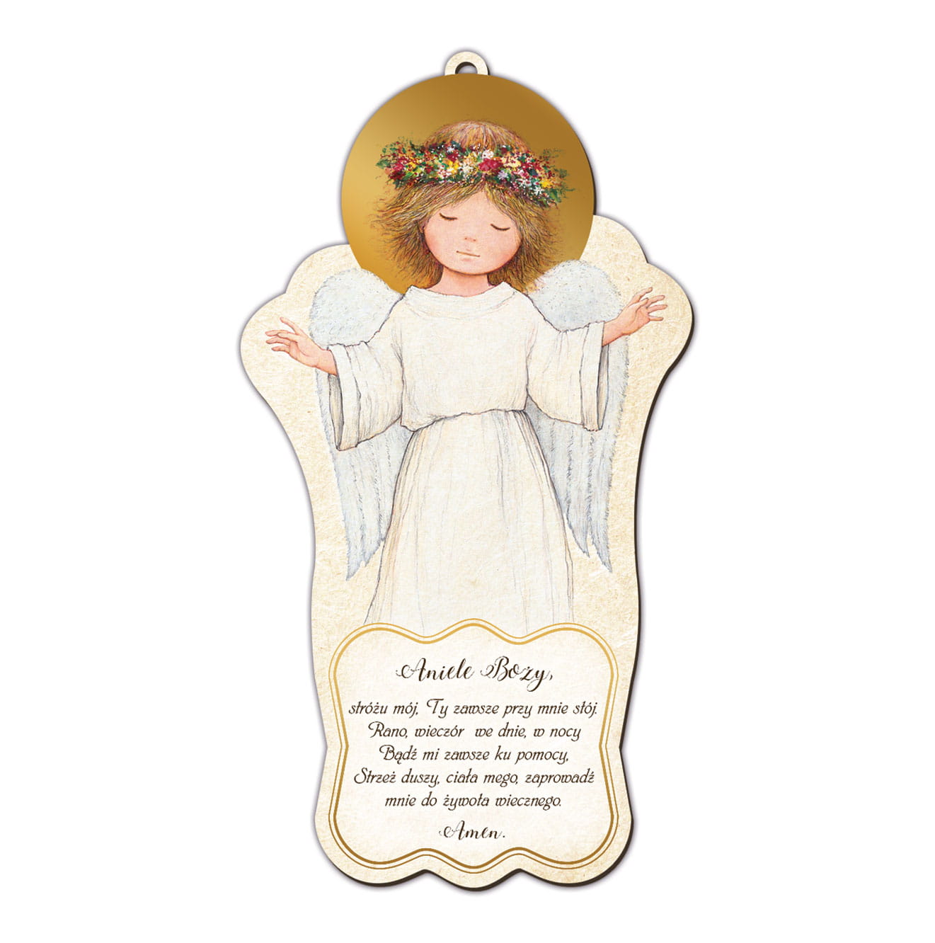Obrazek drewniany w kształcie aniołka. Produkt charakteryzuje się wyjątkową grafiką. Jest to idealna forma upominku z okazji uroczystości Pierwszej Komunii Świętej, Chrztu Świętego.