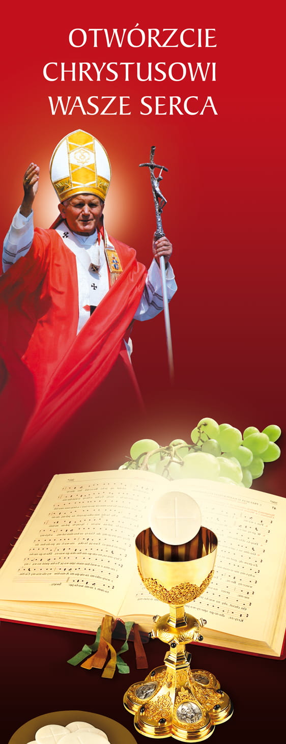 Baner religijny przygotowany specjalnie na uroczystość Bożego Ciała. Na środku produktu znajduje się wizerunek Świętego Jana Pawła oraz symbole związane z Sakramentem Eucharystii. W górnej części banera widnieją słowa: "Otwórzcie Chrystusowi wasze serca".