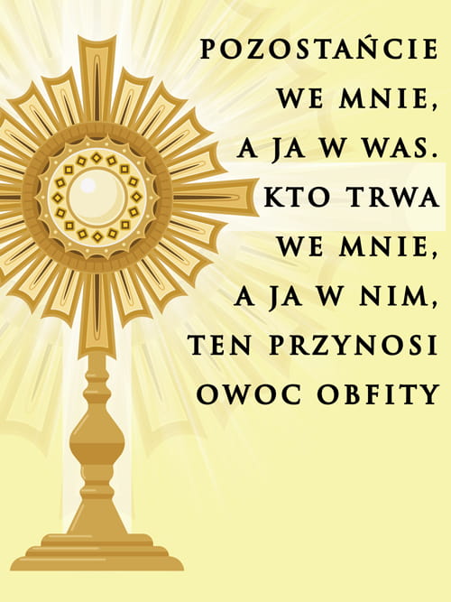 Baner religijny przygotowany specjalnie na uroczystość Bożego Ciała. Na produkcie znajduje się Monstrancja. W górnej części banera religijnego widnieje napis: "Pozostańcie we mnie. A ja w was. Kto trwa we mnie. A ja w nim, ten przynosi owoc obfity".