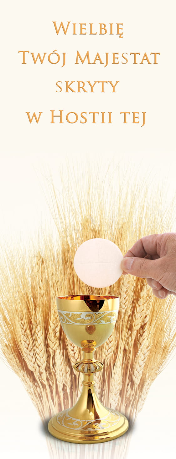 Baner religijny przygotowany specjalnie na uroczystość Bożego Ciała. Na środku produktu znajdują się symbole związane z Sakramentem Eucharystii. W górnej części banera widnieją słowa: "Wielbię Twój majestat skryty w Hostii tej".
