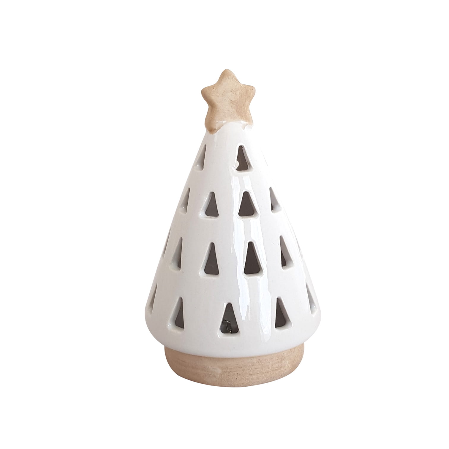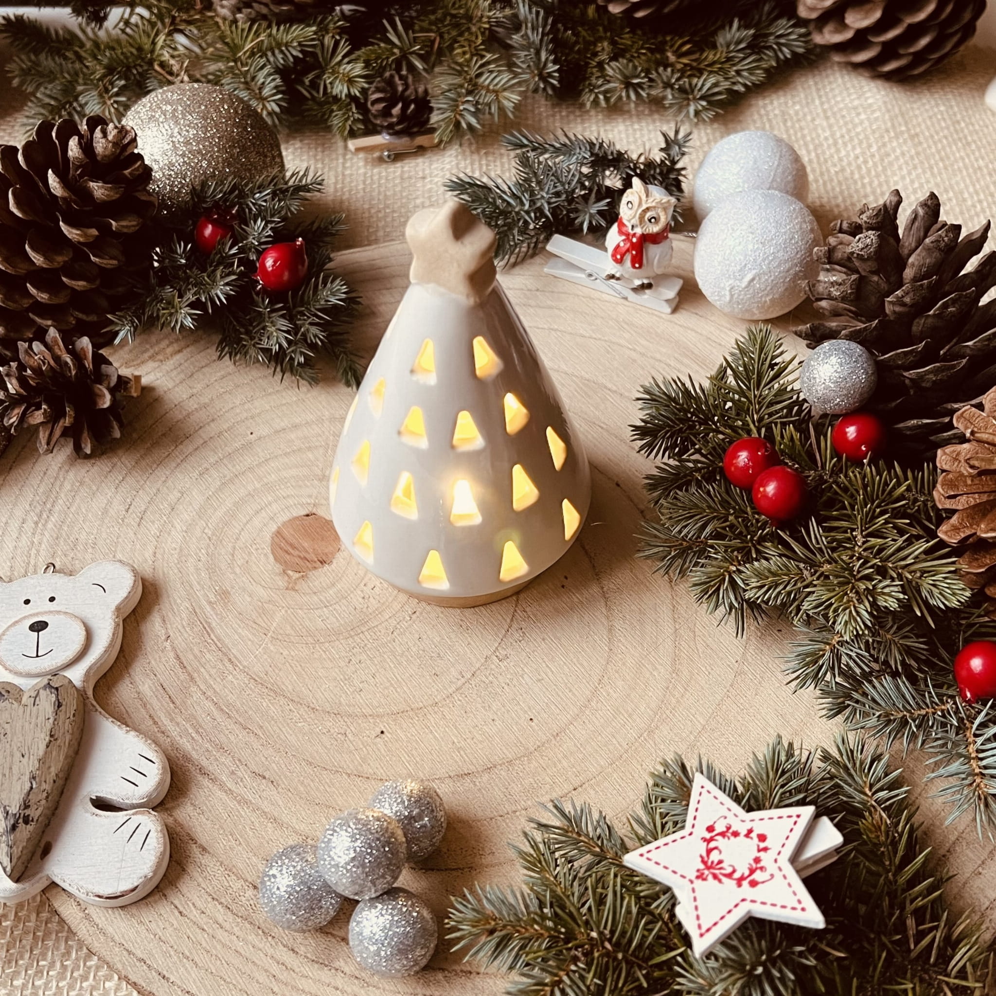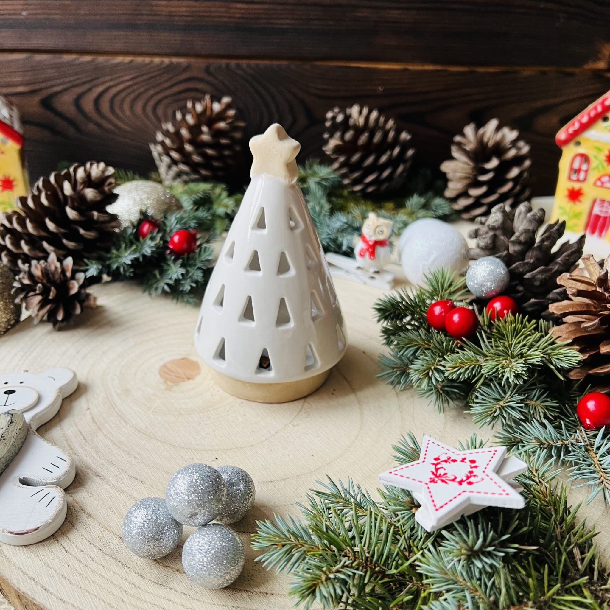 Czerwona dekoracja świąteczna choinka led z otworami przez które wydostaje się przyjemne światło.