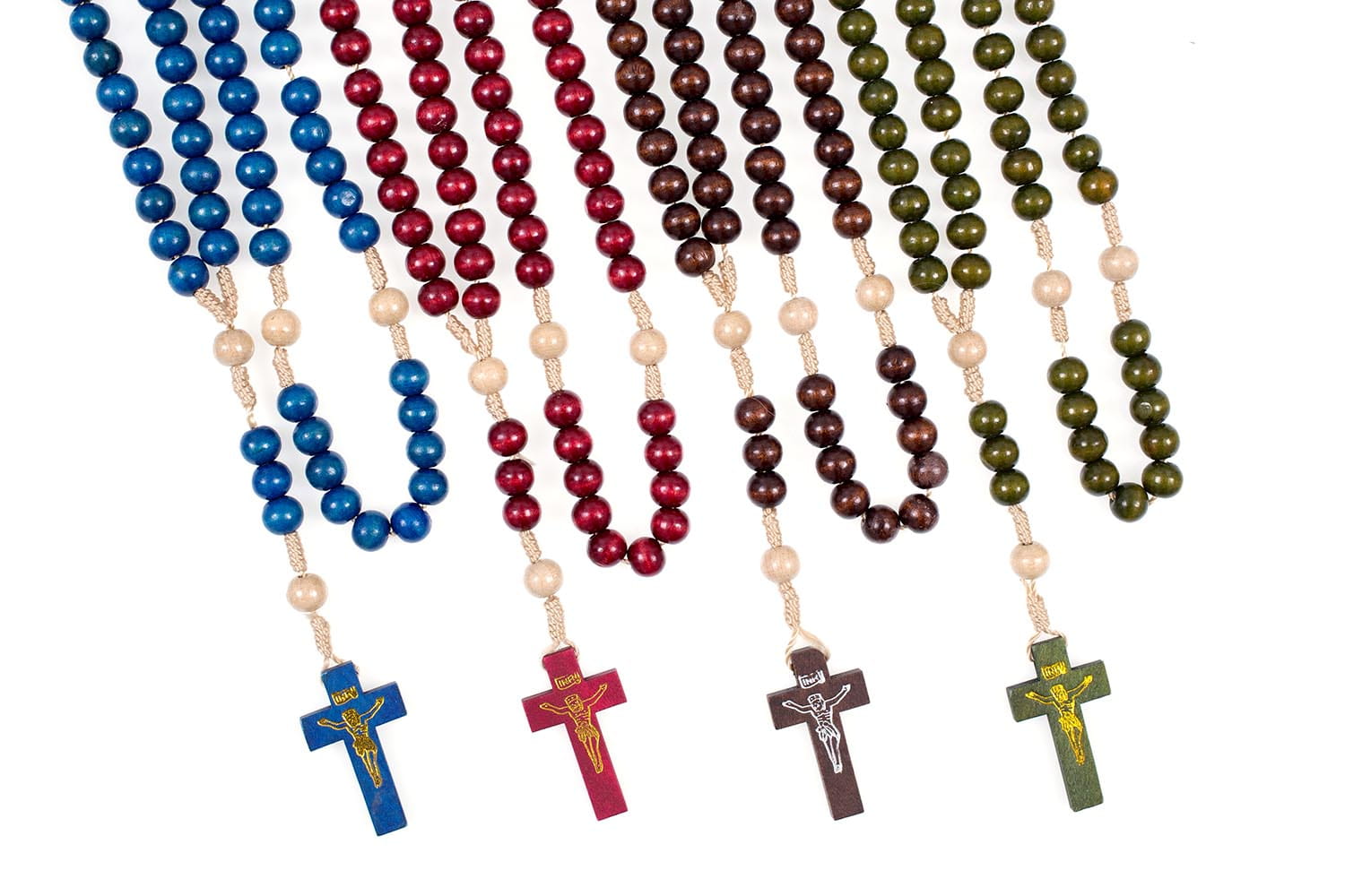 Różaniec z drewna to klasyka, która od pokoleń jest doceniana przez wielu wiernych. W ofercie Kubara dewocjonalia znajdziecie najwyższej jakości różańce drewniane, które swoim subtelnym kształtem urzekną każdego fana prostych form. Różaniec, który prezentujemy charakteryzuje się różnymi wersjami kolorów koralików różańcowych tj. zielony, brązowy, niebieski, oraz bordowy. Gruby sznur łączy paciorki różańcowe. Na drewnianym krzyżyku została wyryta sylwetka Jezusa Chrystusa.