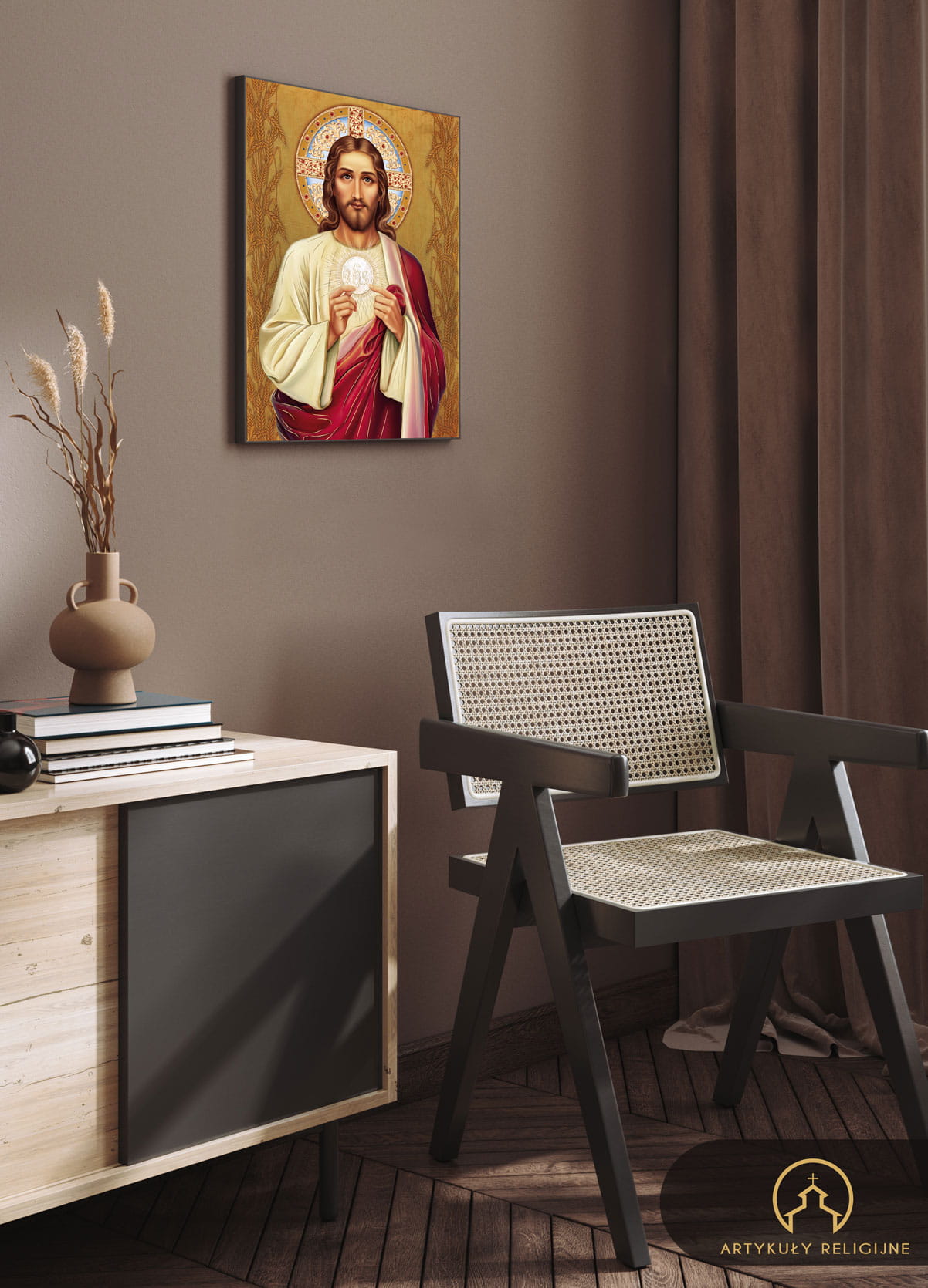 Na ikonie religijnej przedstawiony jest wizerunek Jezusa Chrystusa trzymającego Hostię. Chrystus z Hostią to ikona, która w wyjątkowy sposób przybliża nas do Boga Wszechmogącego -  przedstawionego pod postacią Komunii Świętej.