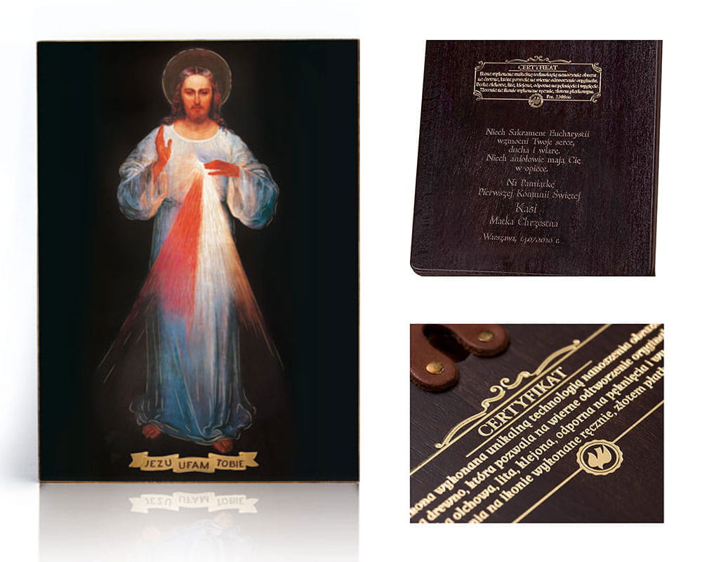 Wizerunek bardzo wyrazisty i trwały, naniesiony na ręcznie złoconą deskę drewnianą. Możliwość wygrawerowania dowolnej treści na odwrocie ikony.