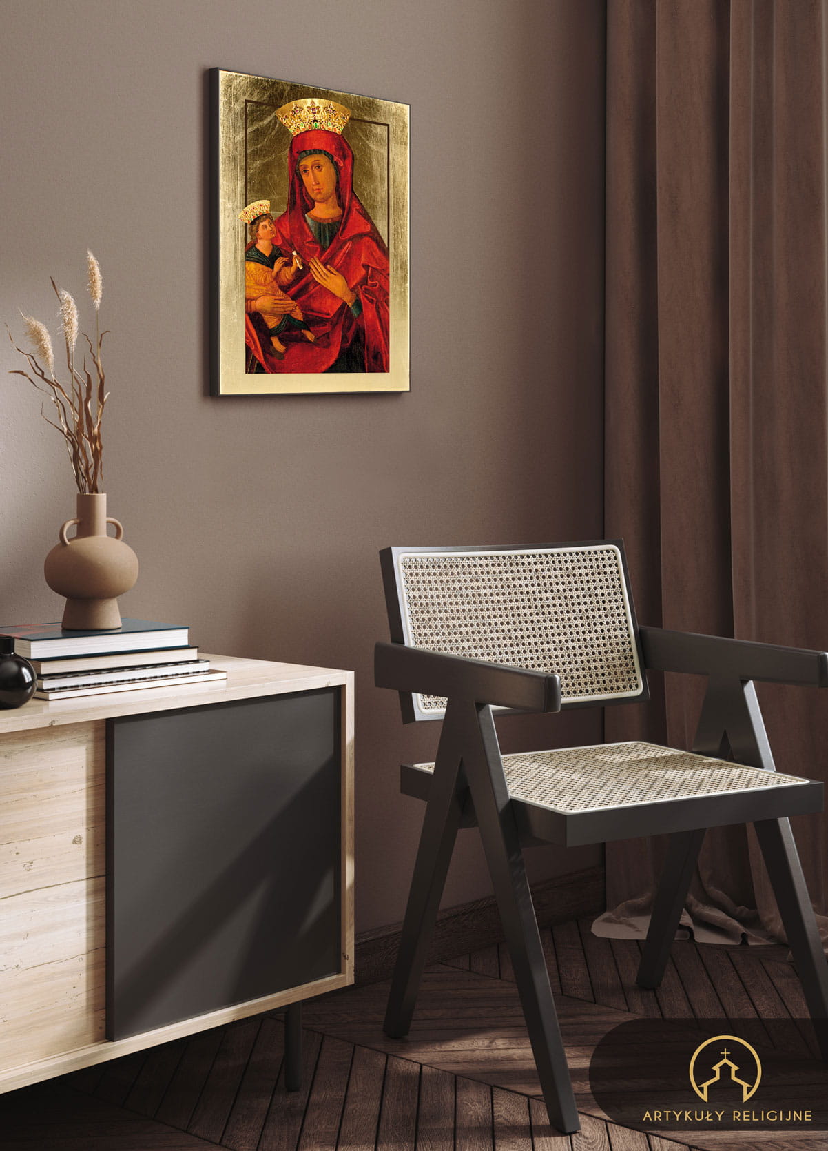 Na prezentowanej ikonie religijnej znajduje się wizerunek Matki Bożej Krzeszowskiej. Cudowny obraz Bogurodzicy jest od wieków czczony w Krzeszowie. Ikona datowana jest na XIII wiek, co czyni ją najstarszym obrazem maryjnym w Polsce. Jest ona o ok. 200 lat starsza od Ikony Matki Bożej Częstochowskiej. Została napisana na desce o wymiarach 60 na 37cm i przedstawia Maryję z Dzieciątkiem na prawym ramieniu, które zwrócone jest twarzą do Matki. Mały Jezusek trzyma w dłoni pergamin Bożej tajemnicy. Głowę i ramiona Bogurodzicy okrywa pofałdowana chusta w kolorze czerwonym. Ta najcieplejsza z barw najsilniej wpływa na zmysł modlących się. Symbolizuje żarzące się światło i ogień, który zawsze był symbolem obecności Boga (krzew gorejący); posiada działanie oczyszczające i jest atrybutem świętości.