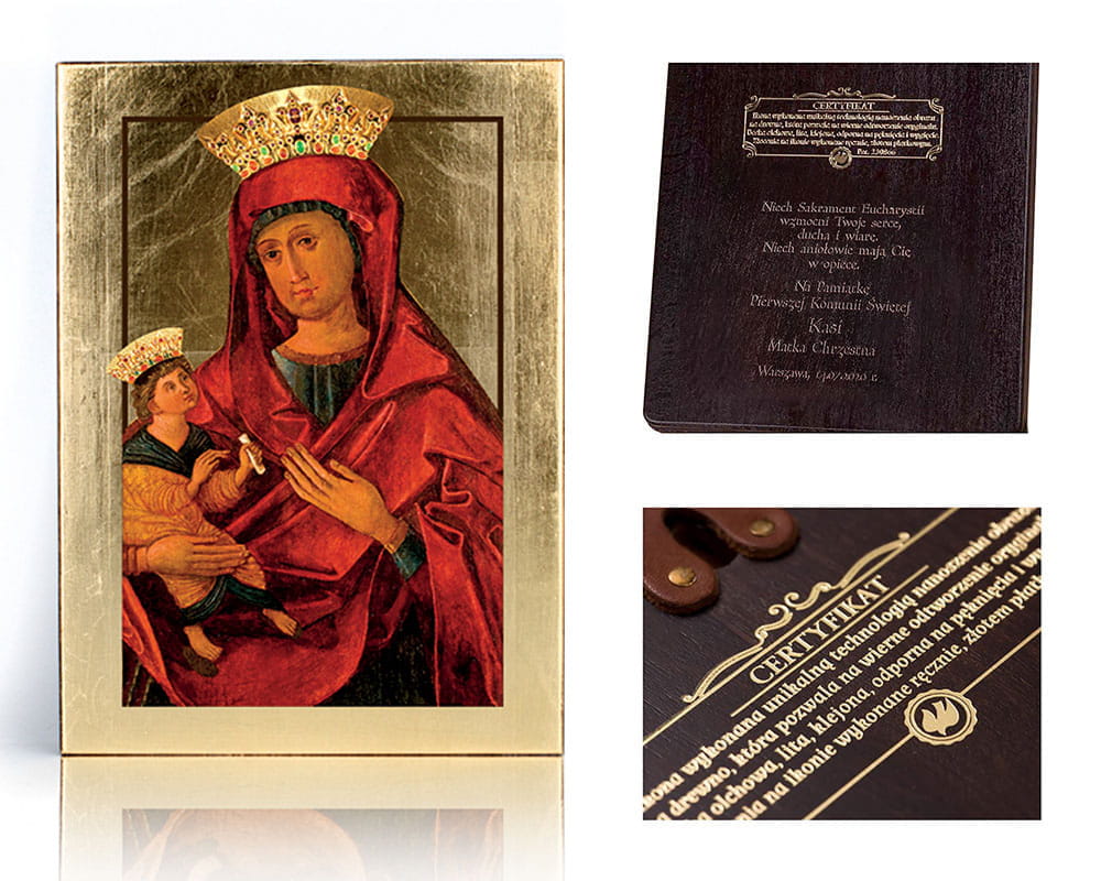 Wizerunek bardzo wyrazisty i trwały, naniesiony na ręcznie złoconą deskę drewnianą. Możliwość wygrawerowania dowolnej treści na odwrocie ikony.