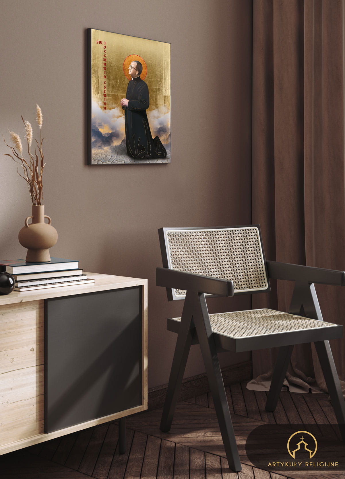 Na prezentowanej ikonie religijnej znajduje się Święty Josemaria Escriva de Balaguer. Święty Josemaria Escriva de Balaguer wstąpił na drogę kapłaństwa  w 1917r. – gdy zimą ujrzał na śniegu ślady stóp karmelity bosego zaczął rozmyślać na temat wielkiego poświęcenia dla Boga. Zdecydował się na ten ważny krok aby w pełni wykonywać wolę Bożą. Uzyskał doktorat z prawa cywilnego, był kapelanem Patronatu Chorych Św. Izabeli. Jego droga powoli prowadziła go do największej misji życia-założenia Opus Dei. Wzmocnił modlitwy i umartwianie, rozpoczął poszukiwania wiernych, którzy także widzą wielkość wizji ukazanej mu przez Boga. Zadaniem Opus Dei jest realizacja katolickiej misji, wartości codziennych uczynków , wypełnianie obowiązków zarówno zawodowych jak i rodzinnych. Główną misją Opus Dei jest kształtowanie członków kościoła, jednakże należy zaznaczyć, że obowiązek poszerzania wiary chrześcijańskiej należy nie tylko do osób duchownych, ale również do osób świeckich. Zachęcał innych, aby w ciągu dnia poświęcali chociaż chwilę na modlitwę do Boga-rozmowę z Nim myślami. Według Josemaria Escriva de Balaguera aby być blisko Wszechmogącego modlitwa nie musi być „wymyślna”, możemy po prostu rozmawiać. Częste uczęszczanie do kościoła powinno przekładać się również na dobre uczynki w życiu.