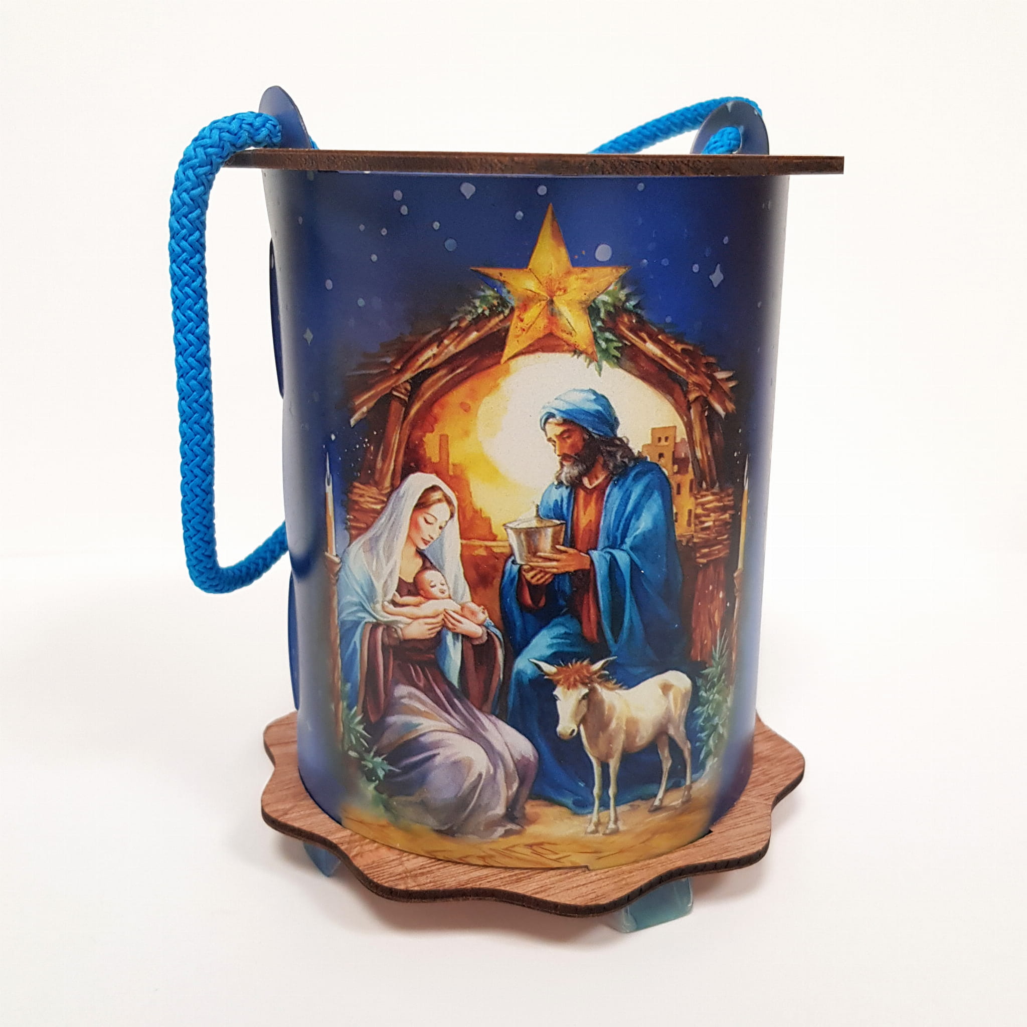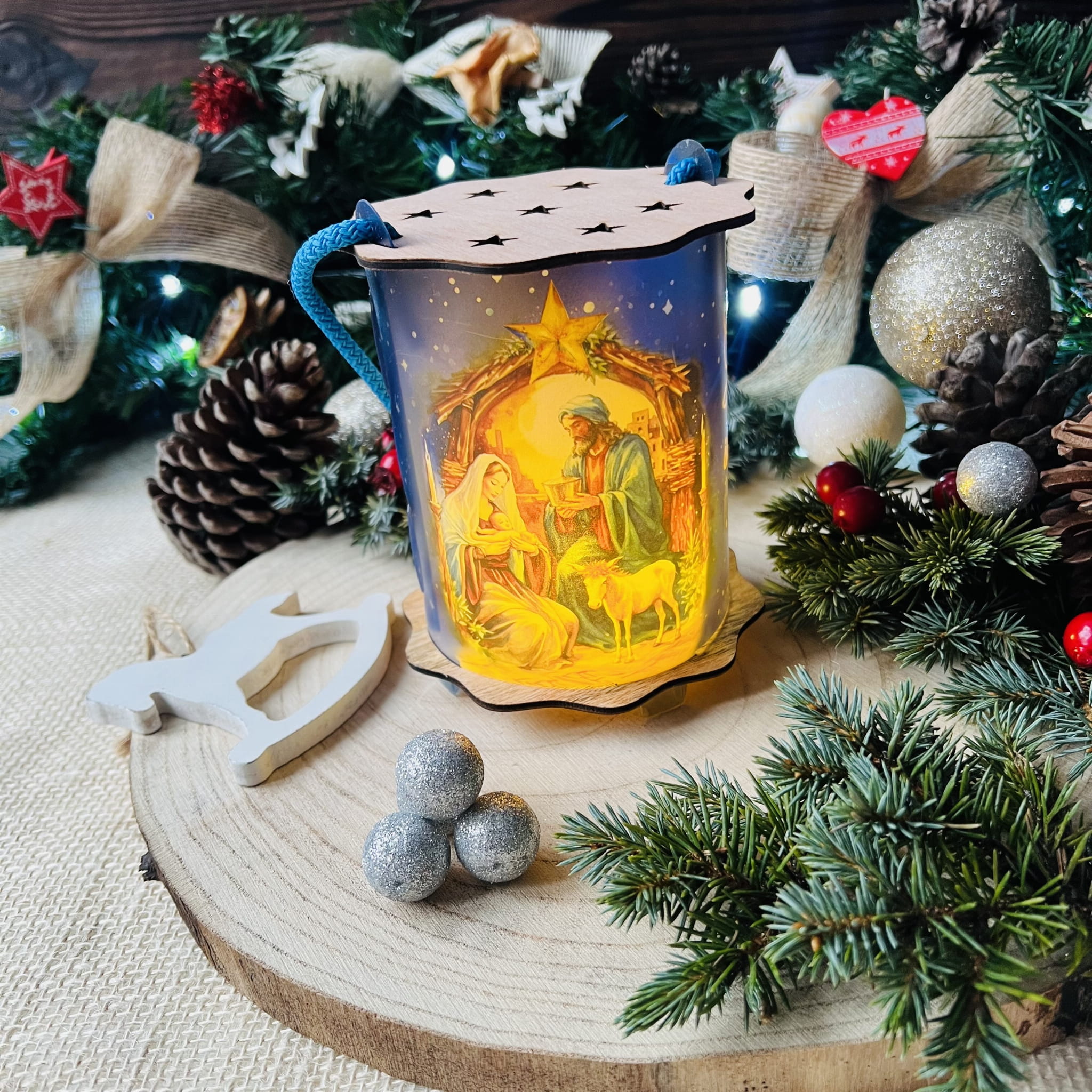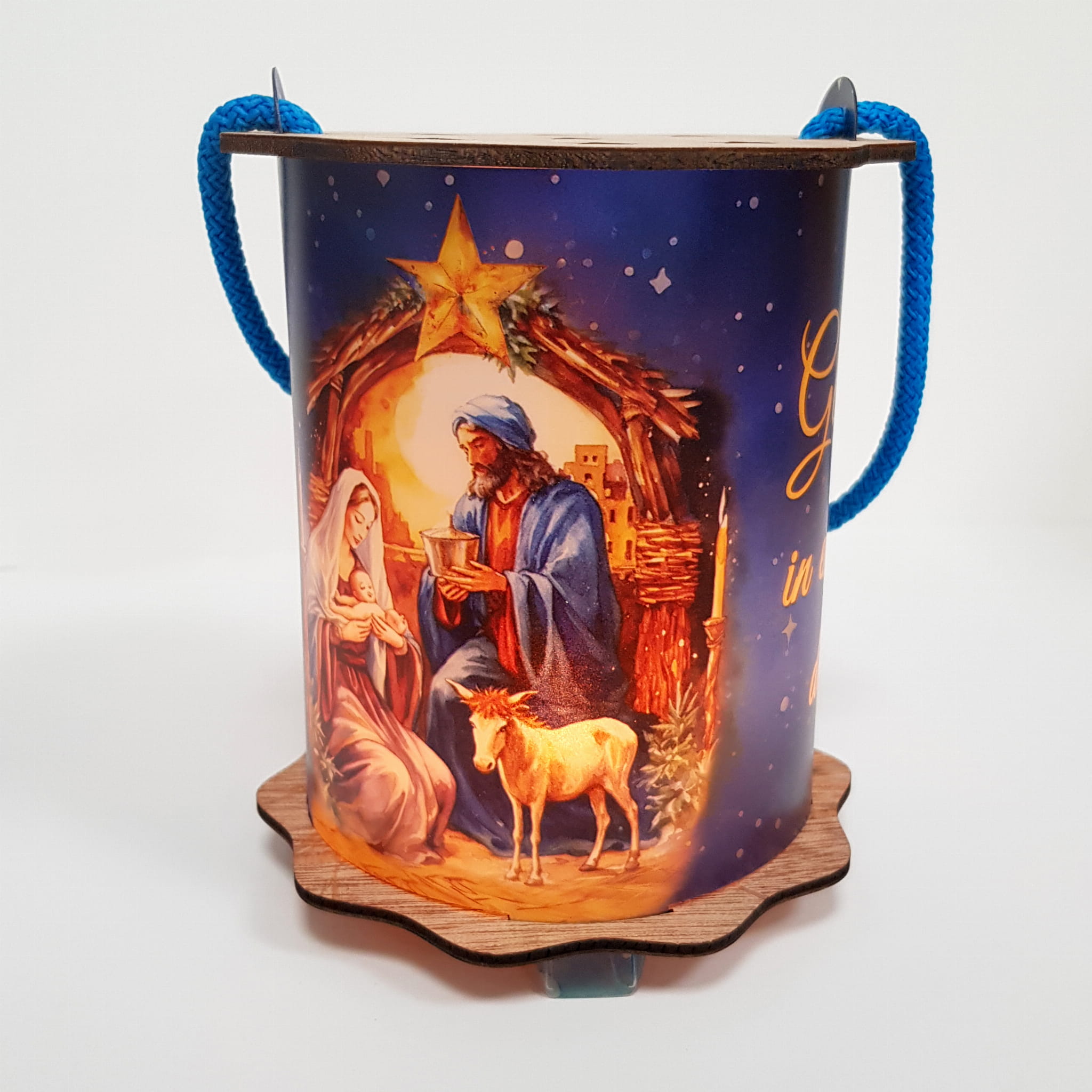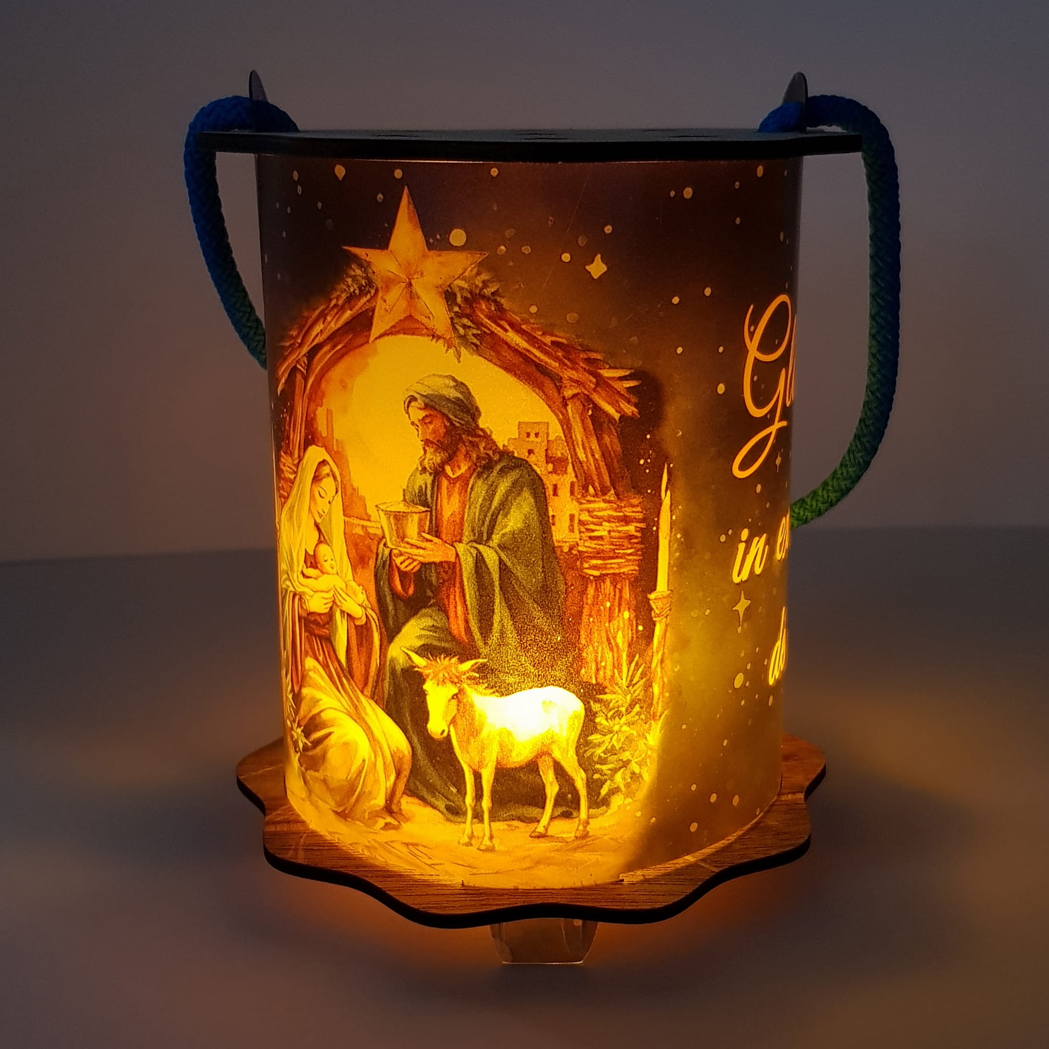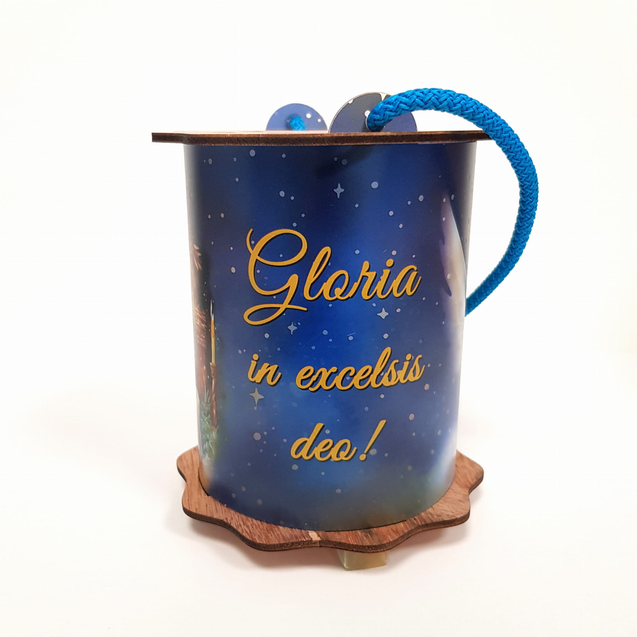 Powyższa oferta dotyczy wyjątkowego lampionu adwentowego wykonanego z drewna i tworzywa sztucznego. Wspaniała grafika umieszczona na lampionie przedstawia szopkę, aniołka i napis Gloria in excelsis deo!
