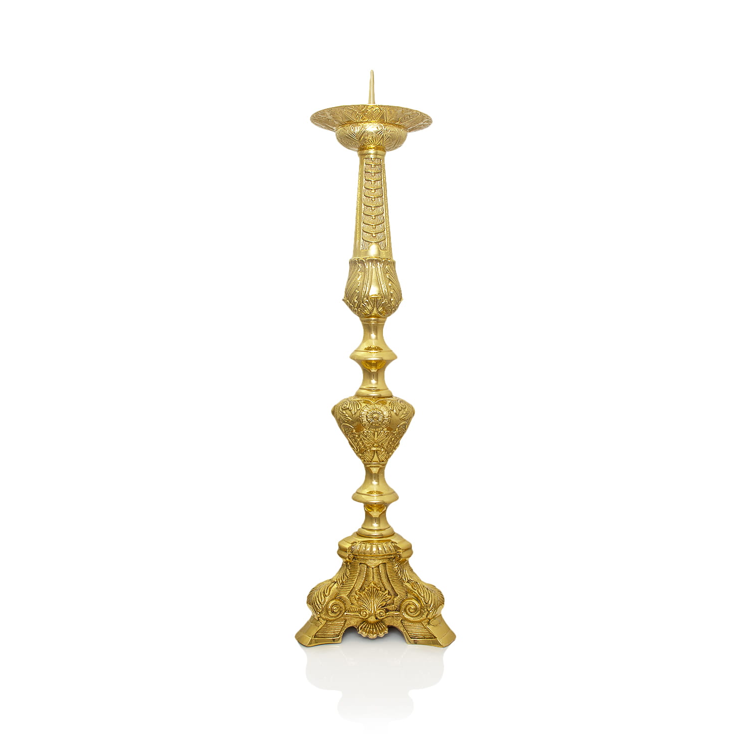 Powyższa oferta dotyczy wspaniałej jakości świecznika liturgicznego. Całość przedmiotu wykonana jest z mosiądzu, który nadaje odpowiednią trwałość i interesujący wygląd. Podstawa świecznika cechuje się bogatym zdobieniem.