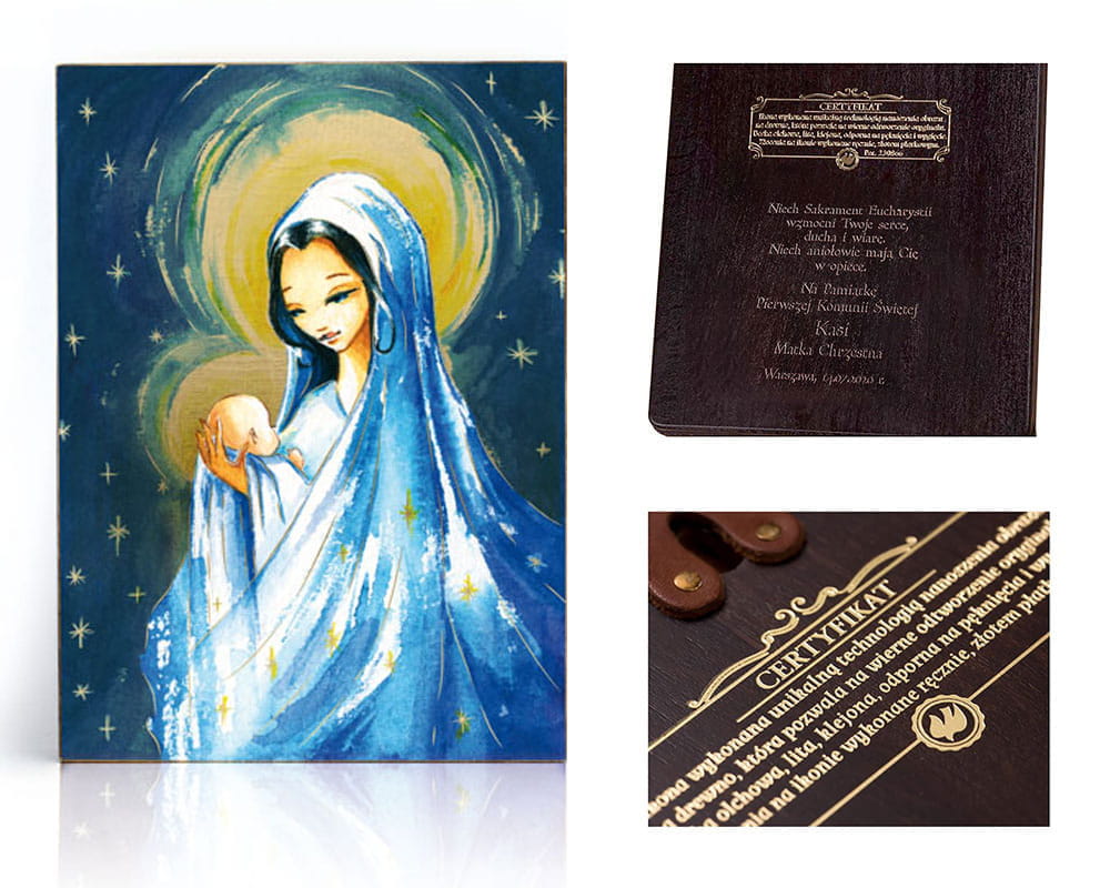 Nasze ikony religijne bardzo dobrze wpasują się w wystrój domu, czy świątyni. Dodatkowo możliwość wygrawerowania dowolnej dedykacji sprawia, że wspaniale sprawdzą się jako upominek z okazji ważnych uroczystości tj. Chrzest Święty, Pierwsza Komunia Święta, zawarcie Sakramentu Małżeństwa czy urodziny. Nasza szeroka oferta zawiera ikony religijne z wizerunkami Świętej Rodziny, Najświętszej Maryi Panny, Jezusa Chrystusa, Aniołów czy postacie Świętych i Błogosławionych.