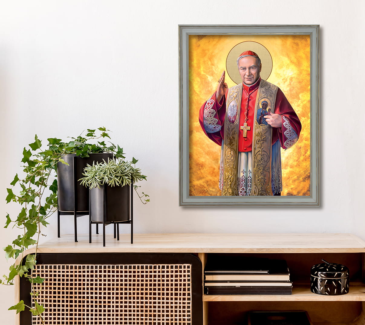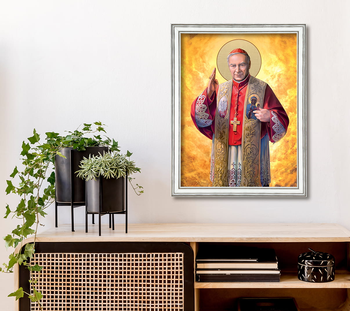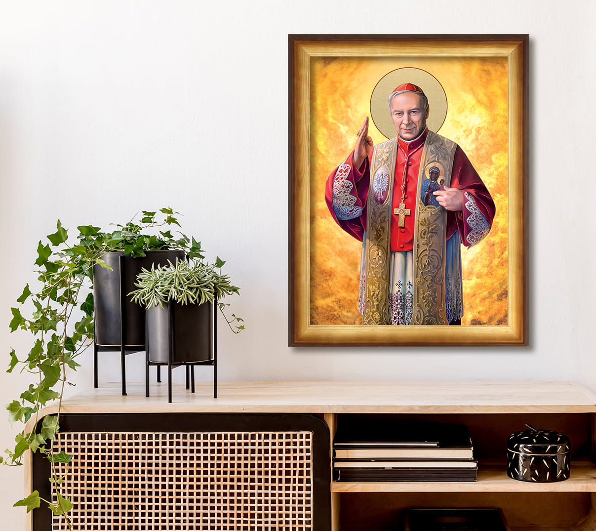 Obraz religijny przedstawia wizerunek Błogosławionego Kardynała Stefana Wyszyńskiego.