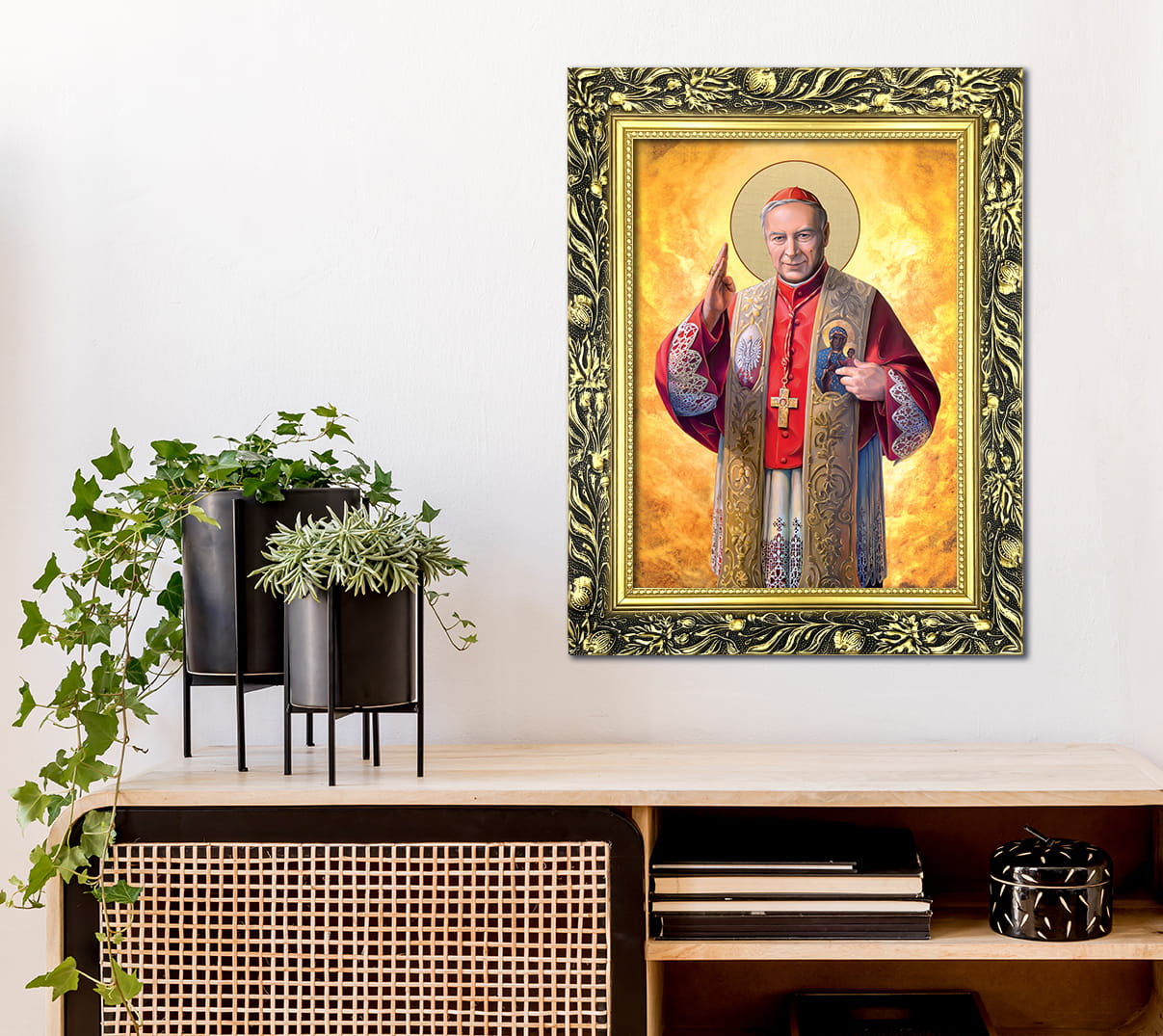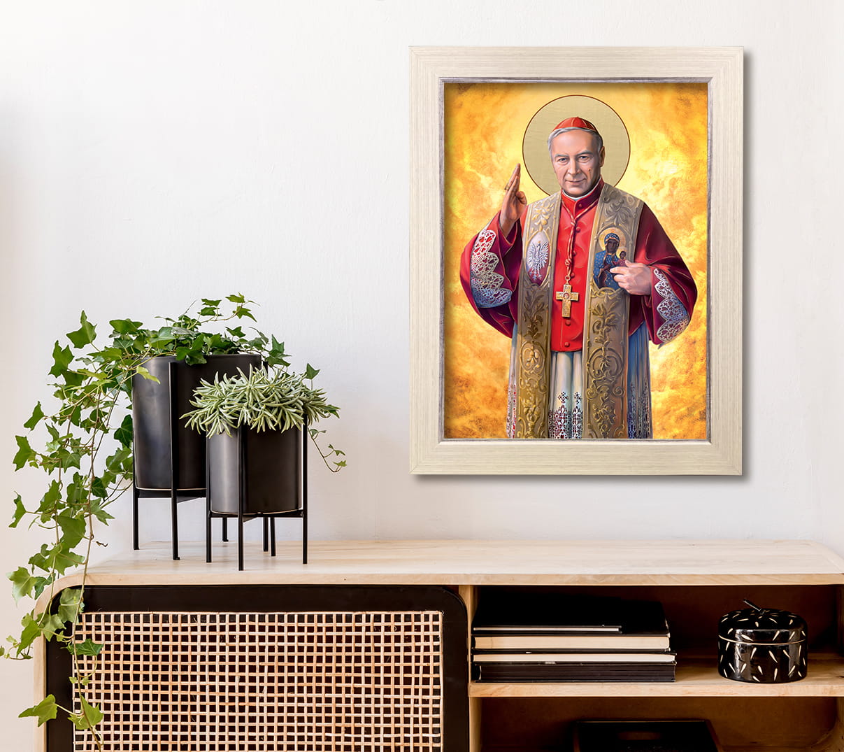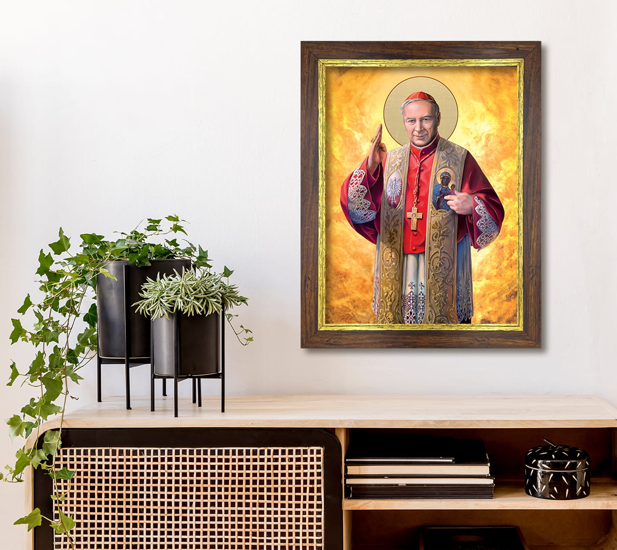 Obraz religijny przedstawia wizerunek Błogosławionego Kardynała Stefana Wyszyńskiego.