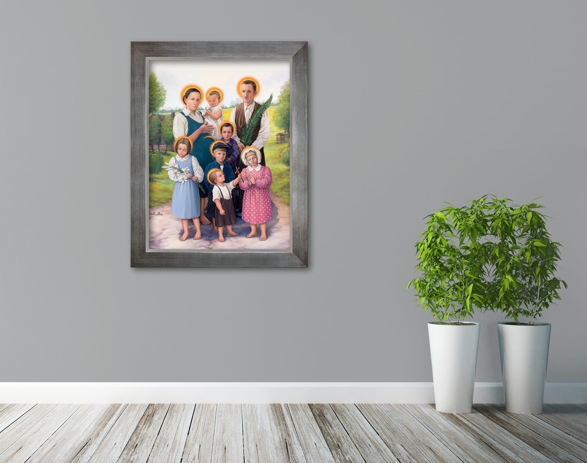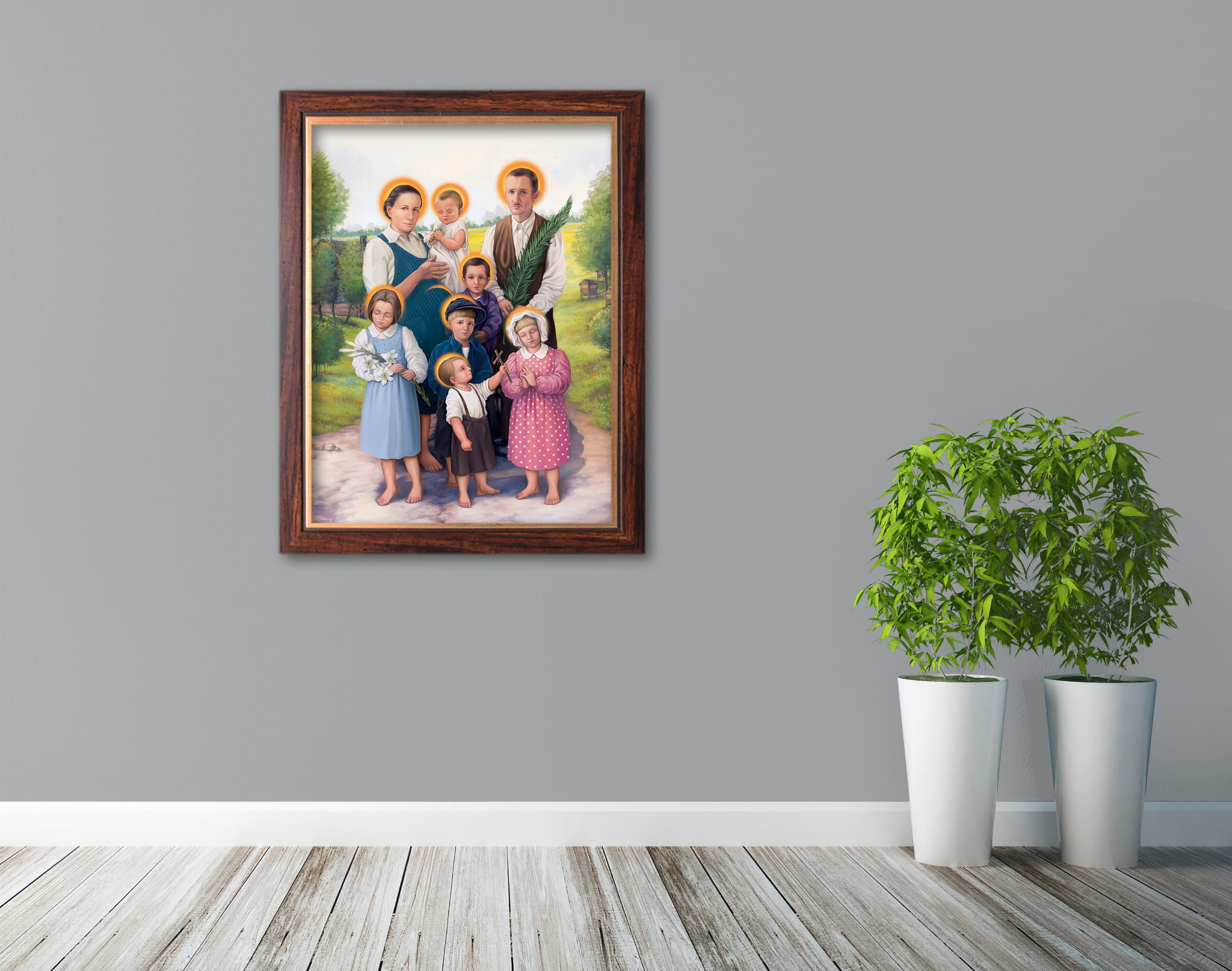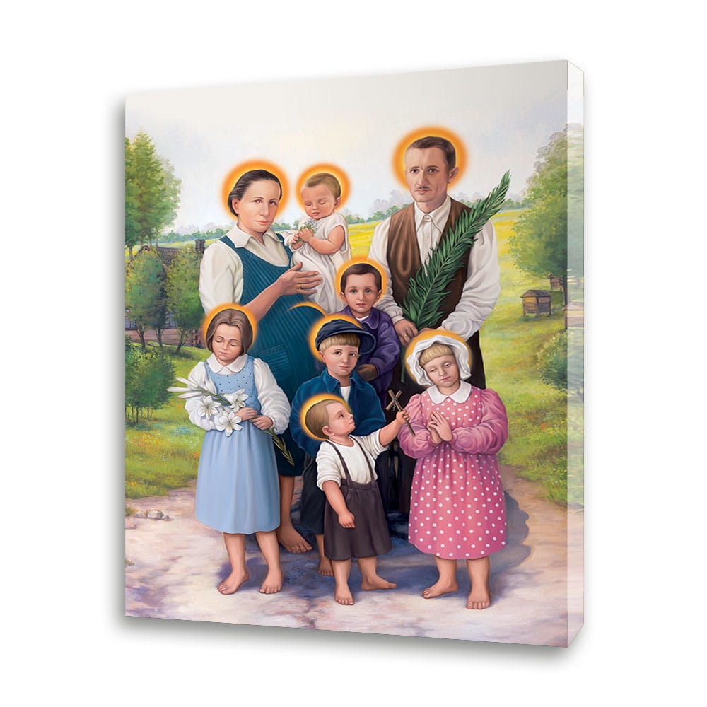 Obraz religijny na wysokiej jakości płótnie przedstawia wizerunek Błogosławionej Rodziny Ulmów.