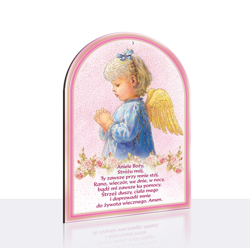 Obrazek religijny z Aniołem Stróżem i śpiącym dzieckiem. Na produkcie znajduje się modlitwa do Anioła Stróża. Obrazek wykonany jest na drewnopodobnym materiale HDF, wycinany laserem. Całość obrazka tworzy wspaniałą kompozycję, która wspaniale sprawdzi się jako upominek dla dziecka i element dekoracyjny do pokoju pociechy.