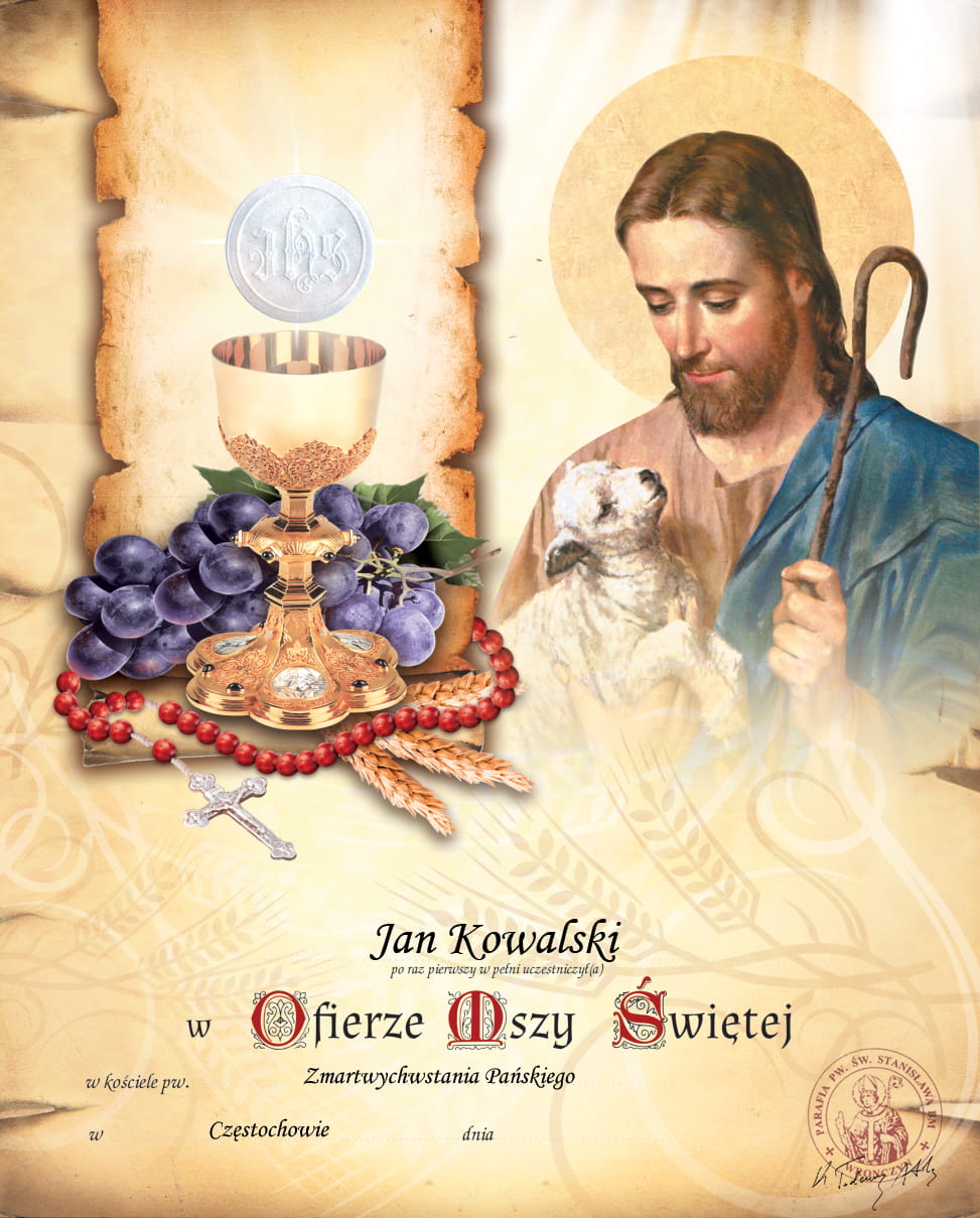 Wraz z obrazkami komunijnymi oferujemy opcję pełnej personalizacji obrazków pierwszokomunijnych, która obejmuje m.in wydrukowanie imion, nazwisk, daty Pierwszej Komunii Świętej, nazwę Parafii w której odbędzie się uroczystość a także pieczątkę oraz podpis księdza.