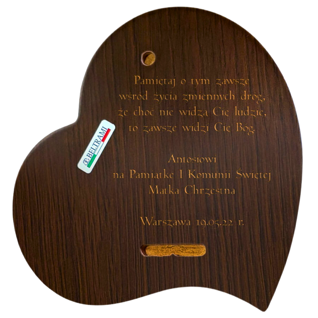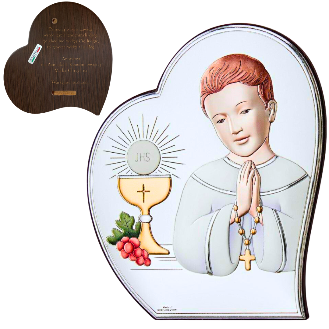 Wspaniałej jakości pamiątka z okazji Pierwszej Komunii Świętej wykonana na drewnie laminowanym srebrem. Obrazek stanowi wyjątkowy upominek upamiętniający najważniejsze wydarzenie w życiu każdego młodego katolika. Oferujemy także możliwość wygrawerowania dowolnej dedykacji na odwrocie pamiątki. Wybrana modlitwa, życzenia sprawią, że produkt nabierze niezwykle personalnego wymiaru i będzie pamiątką na długie lata.