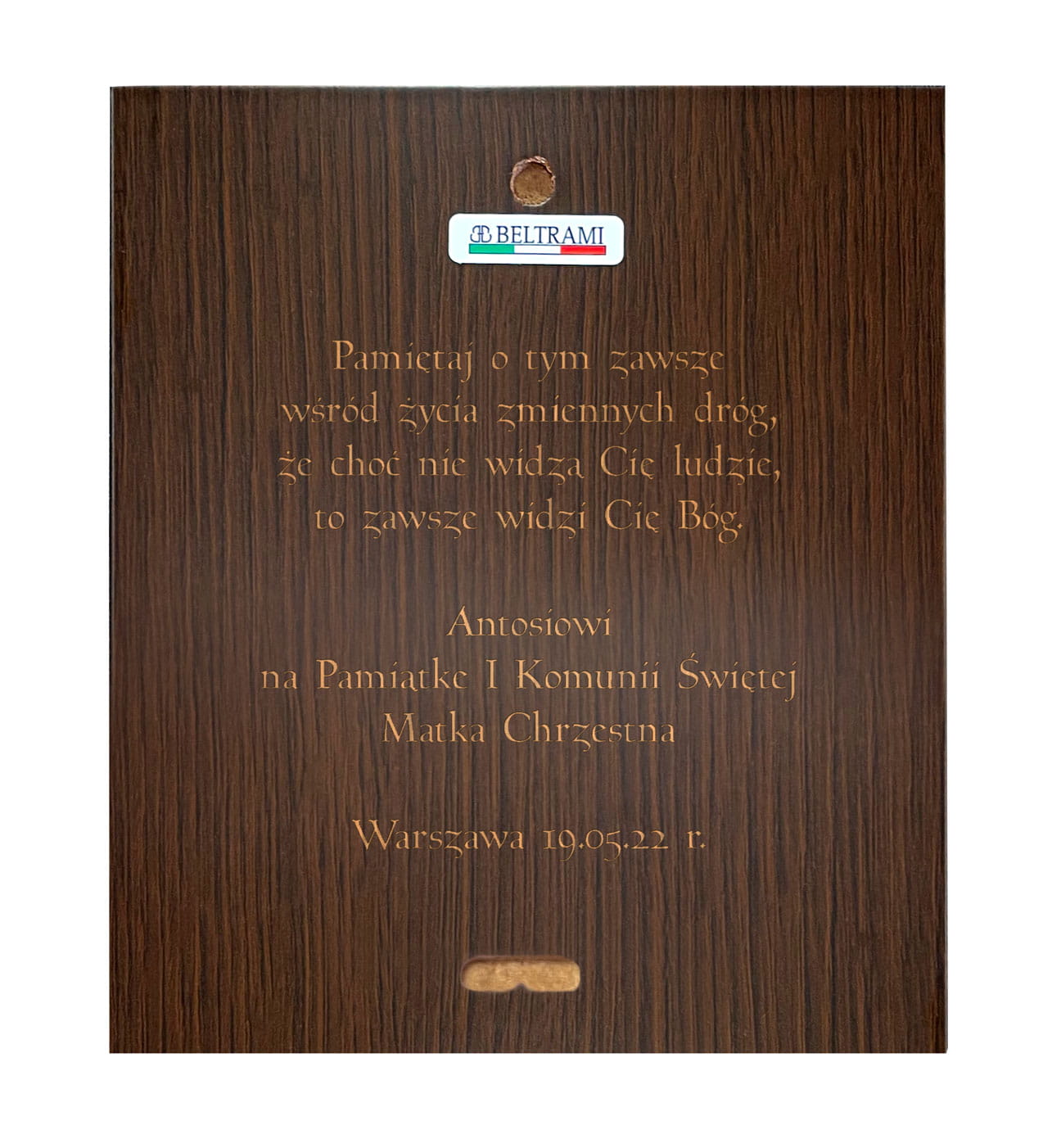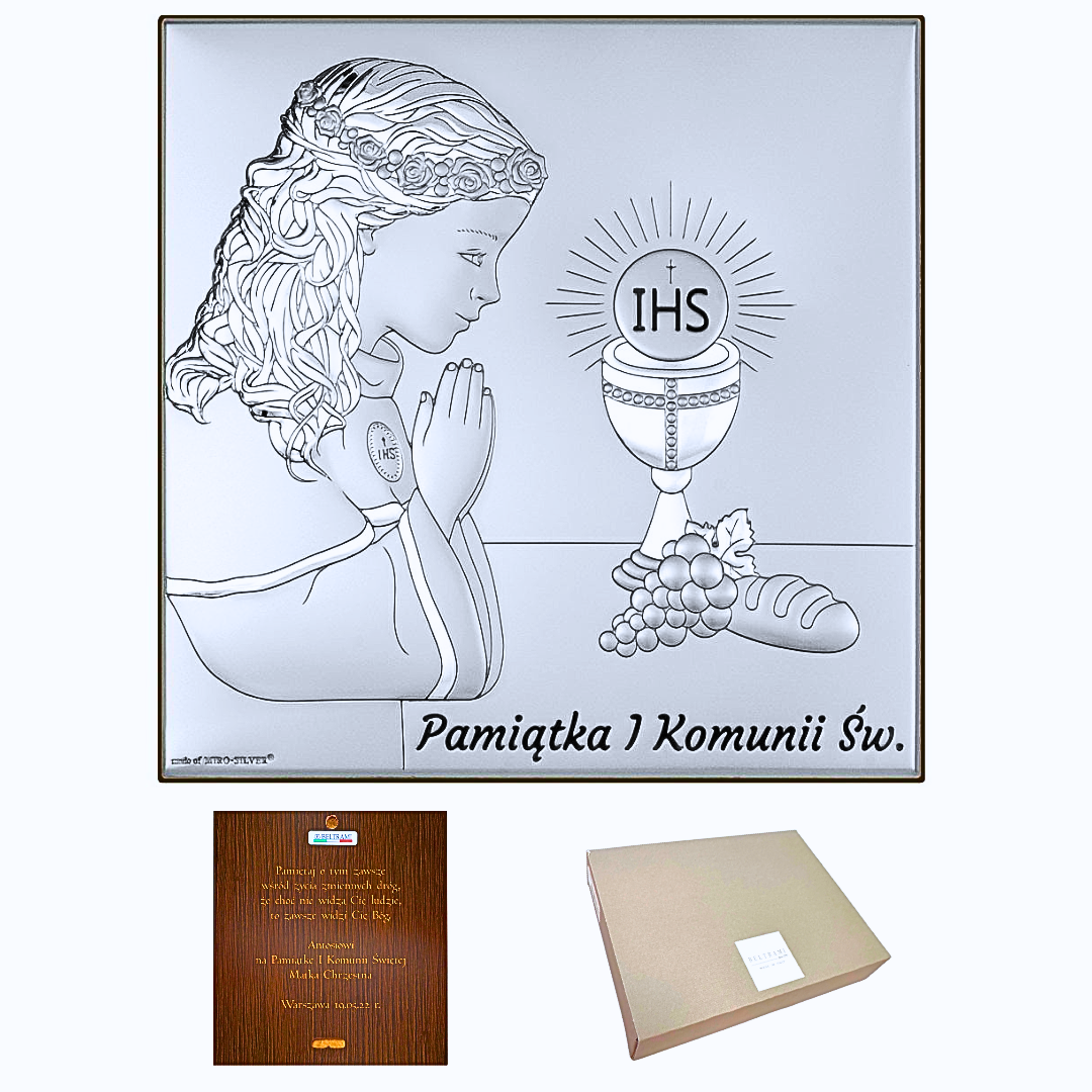 Wspaniałej jakości pamiątka z okazji Pierwszej Komunii Świętej wykonana na drewnie laminowanym srebrem. Obrazek stanowi wyjątkowy upominek upamiętniający najważniejsze wydarzenie w życiu każdego młodego katolika. Oferujemy także możliwość wygrawerowania dowolnej dedykacji na odwrocie pamiątki. Wybrana modlitwa, życzenia sprawią, że produkt nabierze niezwykle personalnego wymiaru i będzie pamiątką na długie lata.