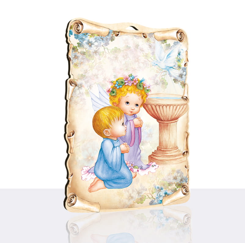 Wyjątkowa uroczystość jaką jest przyjęcie Chrztu Świętego wymaga wspaniałego podkreślenia. W naszej ofercie znajdą Państwo wiele pięknych produktów charakteryzujących się ręcznym wykonaniem. Prezentowana Pamiątka Chrztu Świętego cechuje się wspaniałą grafiką przedstawiającą Aniołka oraz dziecko. Z tyłu znajdują się miejsca na wpisanie najważniejszych informacji na temat Sakramentu Chrztu, m.in. imiona i nazwiska rodziców, rodziców chrzestnych, księdza który udzielił Sakramentu itp.