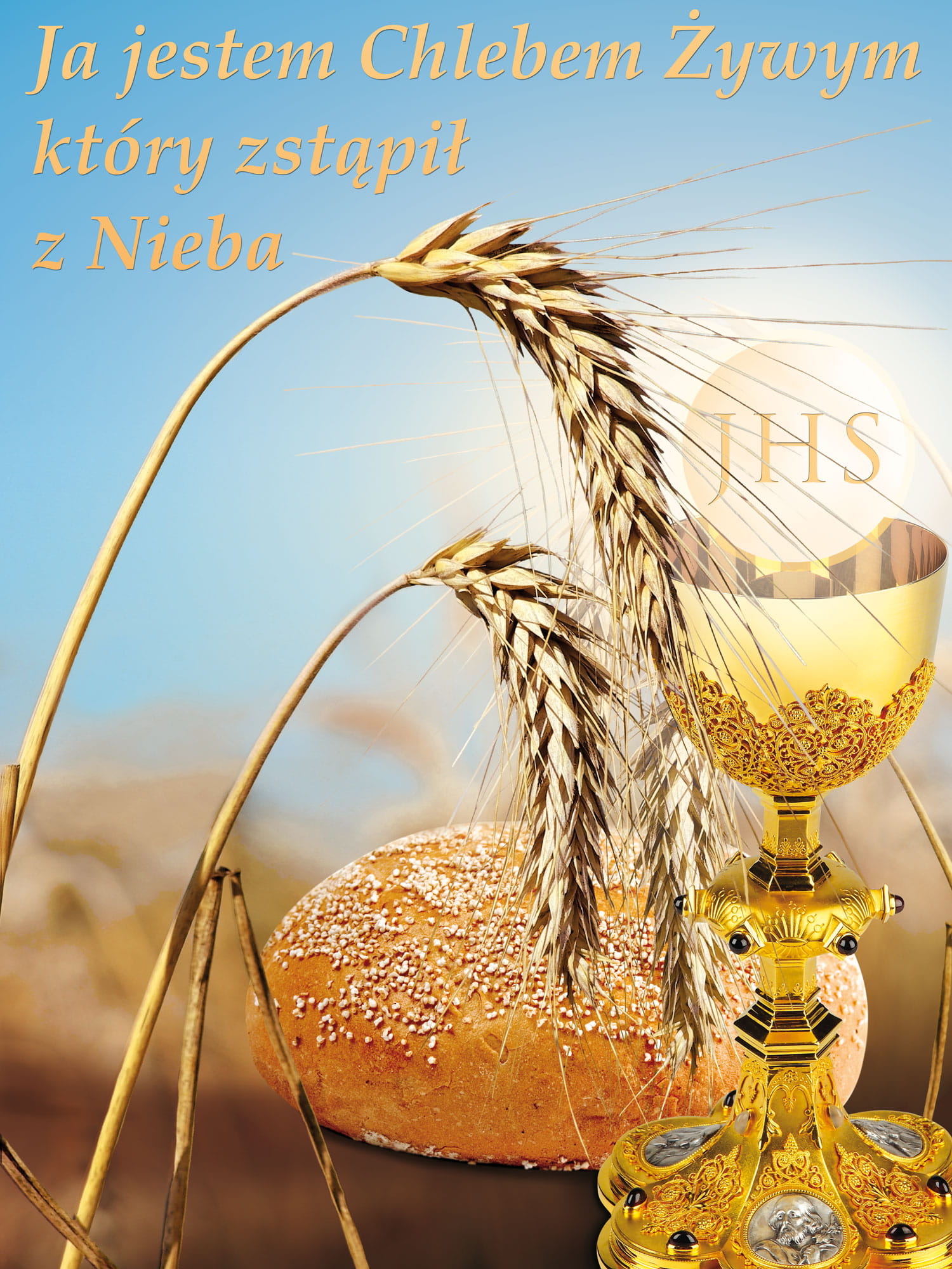 Baner religijny przygotowany specjalnie na uroczystość Bożego Ciała. Na produkcie znajduje się bochenek chleba i kielich z Hostią. W tle widnieją kłosy zboża. W górnej części banera widnieją słowa: "Ja jestem chlebem żywym który zstąpił z nieba".