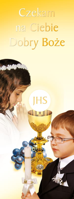 Baner na I Komunię Świętą "Czekam na Ciebie, Dobry Boże" 50x130 cm
