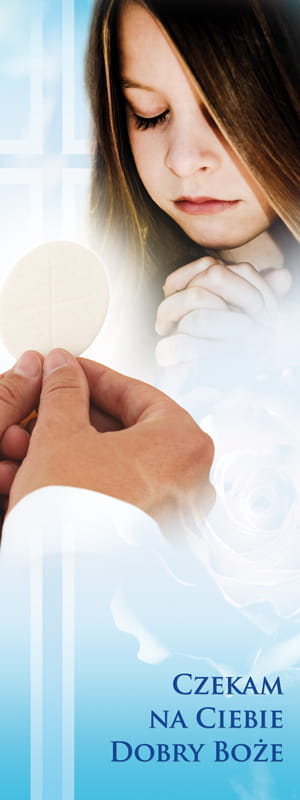 Baner religijny przygotowany specjalnie z okazji Sakramentu Pierwszej Komunii Świętej. Na środku produktu widnieje dziewczynka podczas modlitwy. W dolnej części banera widnieją słowa: "Czekam na Ciebie Dobry Boże".
