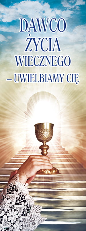 Baner charakteryzuje się jasnymi barwami. W górnej części baneru znajduje się napis "Dawco życia wiecznego - uwielbiamy Cię". Wyraźne kolory, grafika i napis sprawiają, że produkt prezentuje się wspaniale. Baner jest widoczny nawet z dalekiej odległości.