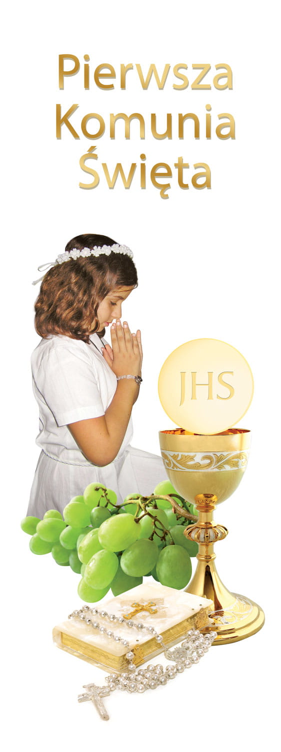 Baner religijny przygotowany specjalnie na uroczystość Pierwszej Komunii Świętej. Na produkcie znajduje się dziewczynka przystępująca do Pierwszej Komunii Świętej oraz przedmioty których przeznaczenie związane jest z Sakramentem Eucharystii. W górnej części banera religijnego widnieje napis: "Pierwsza Komunia Święta".