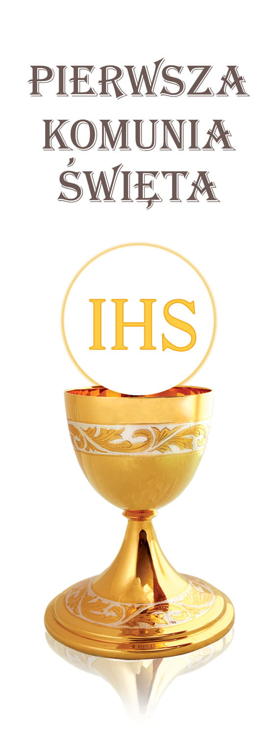 Baner religijny przygotowany specjalnie na uroczystość Pierwszej Komunii Świętej. Na produkcie znajduje się Kielich mszalny z Hostią. W górnej części banera religijnego widnieje napis: "Pierwsza Komunia Święta".