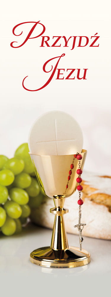 Baner religijny przygotowany specjalnie na uroczystość Pierwszej Komunii Świętej. Na produkcie znajdują się przedmioty których przeznaczenie związane jest z Sakramentem Eucharystii. Kielich mszalny z Hostią, otulony różańcem umieszczony został w centralnym punkcie produktu. W górnej części banera religijnego widnieje napis: "Przyjdź Jezu".