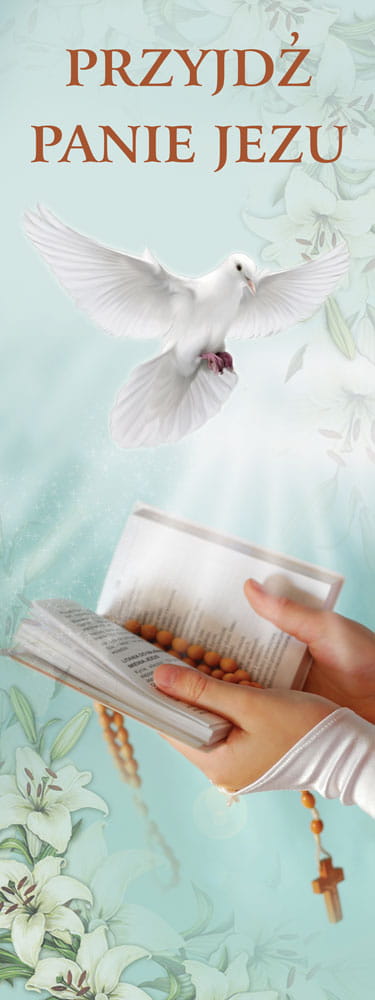 Baner religijny przygotowany specjalnie na uroczystość Pierwszej Komunii Świętej. Na produkcie znajdują się dłonie trzymające otwartą książeczką modlitewną z zawieszonym różańcem. Biała gołębica widniejąca w tle symbolizuje obecność i błogosławieństwo Ducha Świętego. W górnej części banera religijnego widnieje napis: "Przyjdź Panie Jezu".