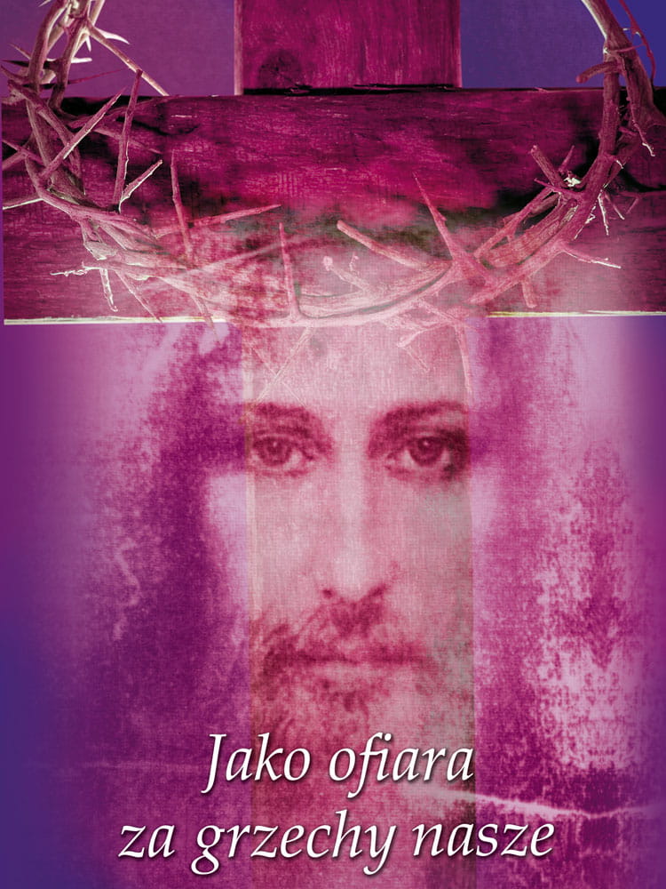 W centralnej części prezentowanego banera religijnego znajduje się wizerunek Jezusa Chrystusa. W dolnej części produktu widnieją słowa "Jako ofiara za grzechy nasze."