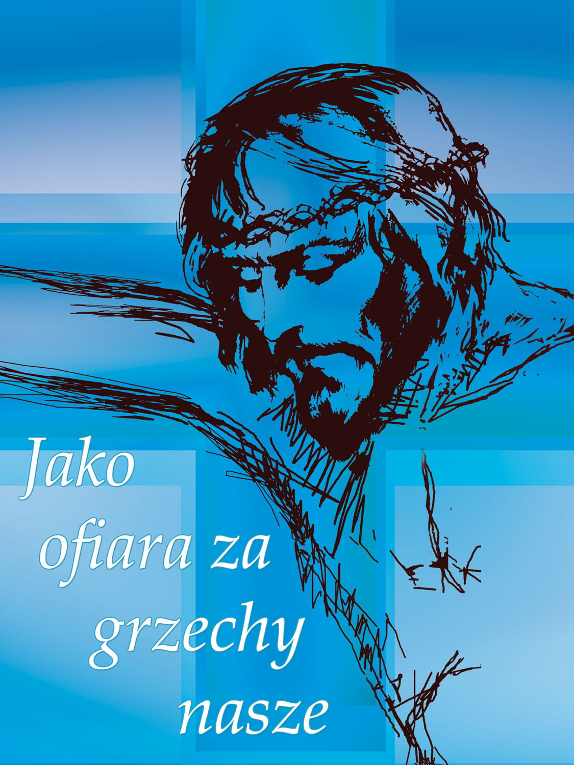 W centralnej części prezentowanego banera religijnego znajduje się wizerunek Jezusa Chrystusa Umęczonego. W dolnej części produktu widnieją słowa "Jako ofiara za grzechy nasze."