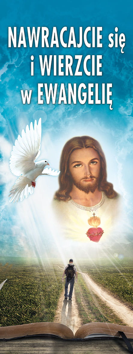W centralnej części prezentowanego banera religijnego znajduje się wizerunek Jezusa Miłosiernego i Ducha Świętego. W górnej części produktu widnieje napis: "Nawracajcie się i wierzcie w Ewangelię".