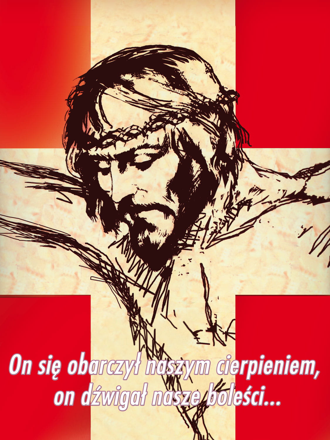 W centralnej części prezentowanego banera religijnego znajduje się wizerunek Jezusa Chrystusa Umęczonego. W dolnej części produktu widnieją słowa : "On się obarczył naszym cierpieniem, on dźwigał nasze boleści."