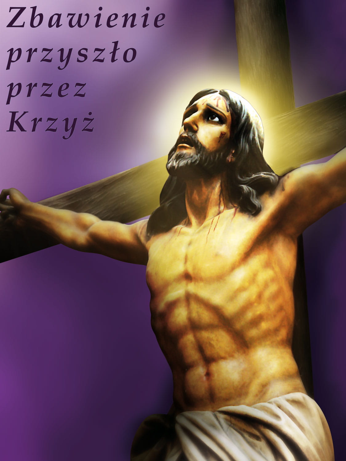 W centralnej części prezentowanego banera religijnego znajduje się wizerunek Jezusa Chrystusa Umęczonego. W górnej części produktu widnieją słowa "Zbawienie przyszło przez Krzyż."