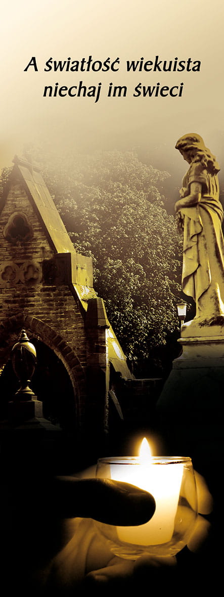W centralnej części prezentowanego banera religijnego znajduje się dłoń trzymająca zapalony znicz oraz figura Anioła. W górnej części produktu widnieją słowa "A światłość wiekuista niechaj im świeci"