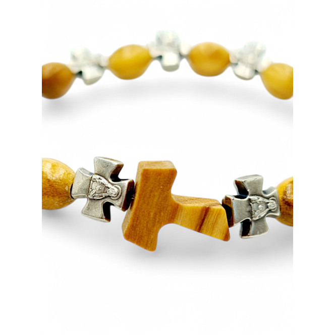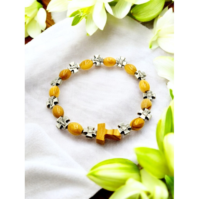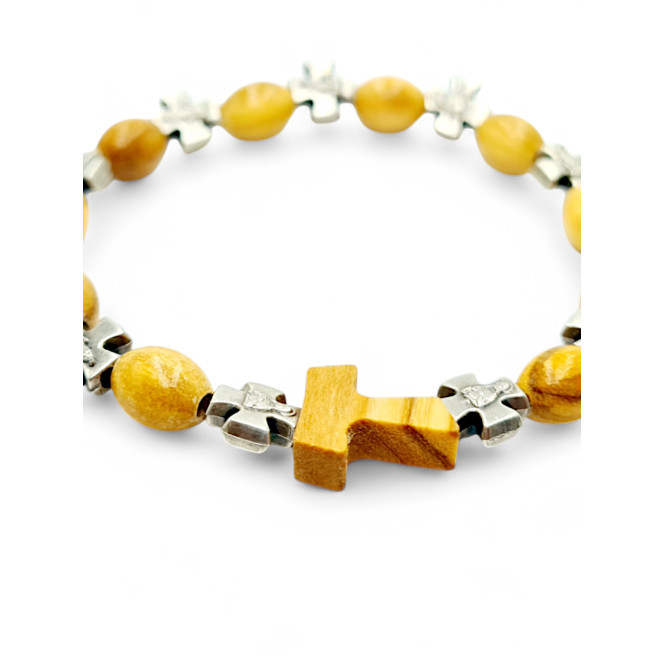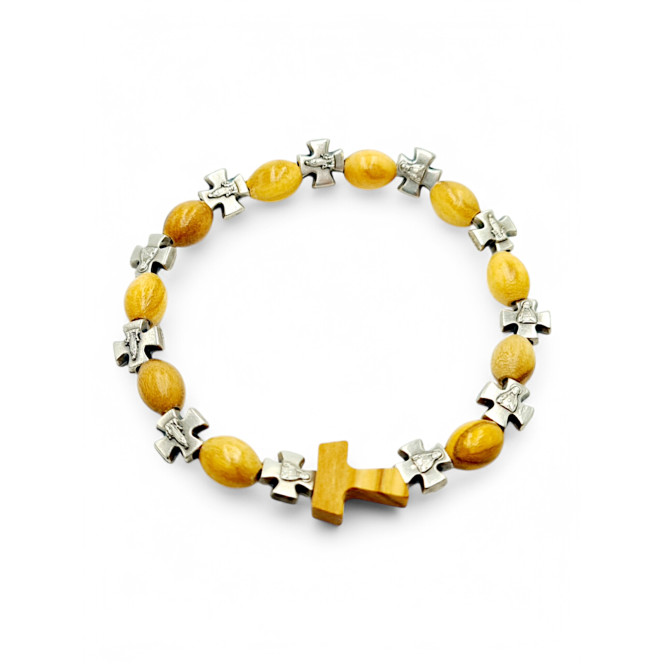 koralików z drewna oliwnego oraz metalowych elementów z motywem krzyża. Subtelna i elegancka, idealna do codziennego noszenia jako symbol wiary.