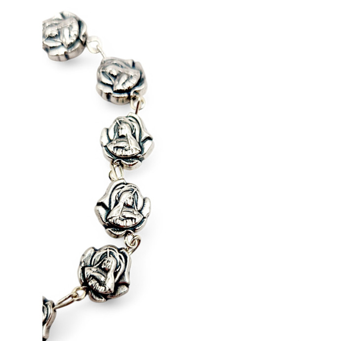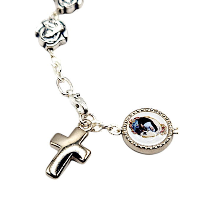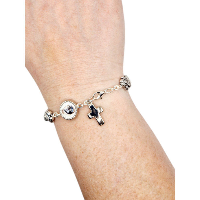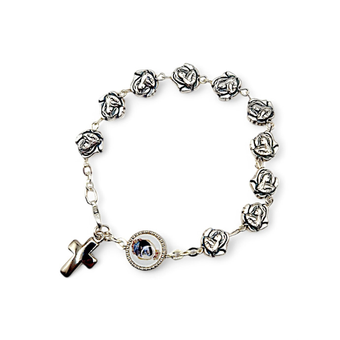 Bransoletka św. Rity z ozdobnych ogniw w kształcie Jej wizerunku, wykończona medalikiem oraz krzyżykiem.