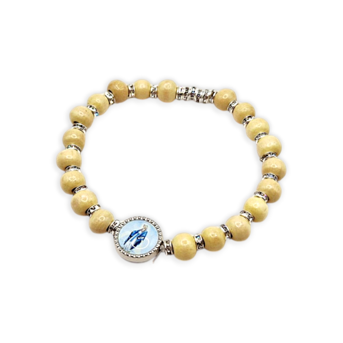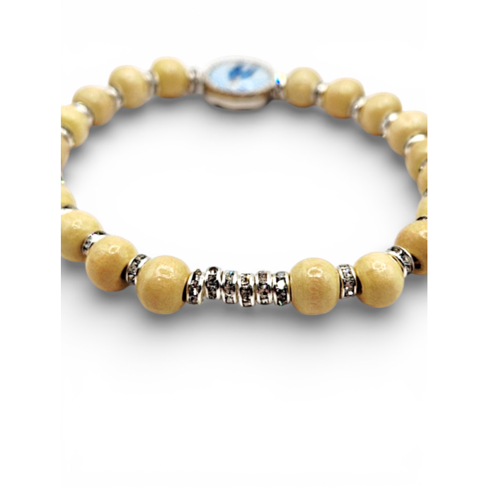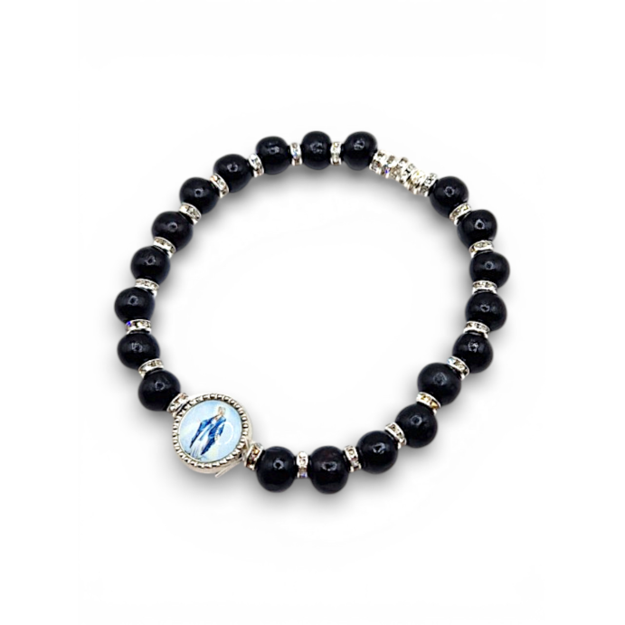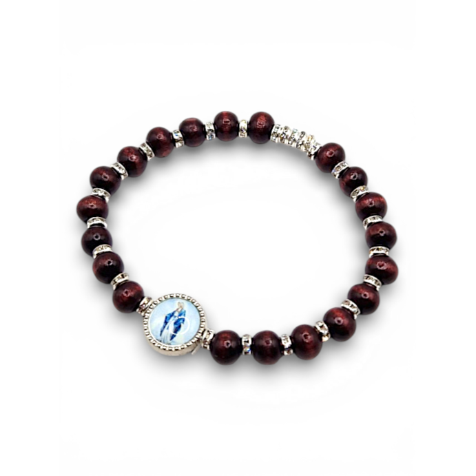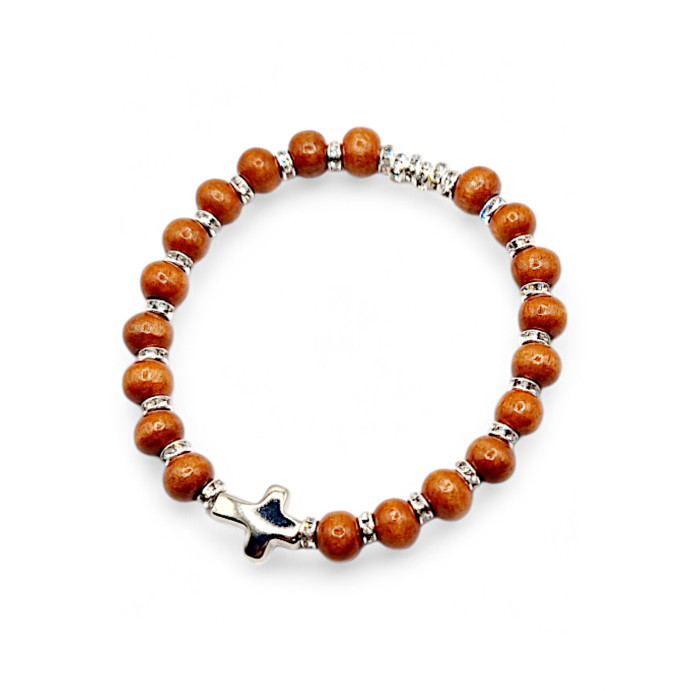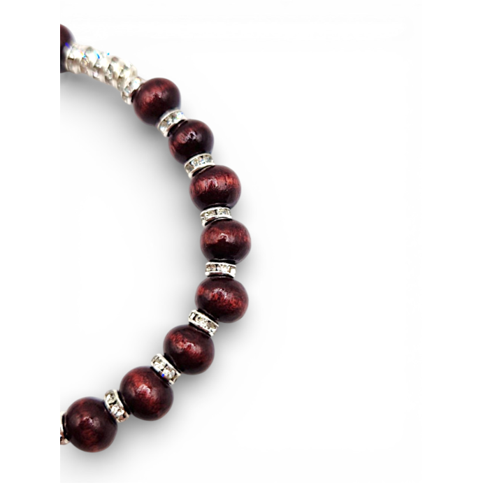 Stylowa bransoletka o religijnym charakterze, wykonana z połączenia skóry i metalowych elementów z motywem krzyża. Elegancka biżuteria religijna, idealna do codziennego noszenia jako symbol wiary.