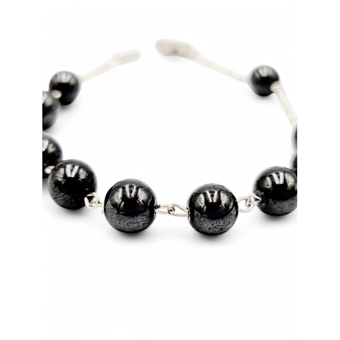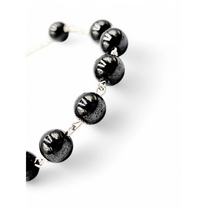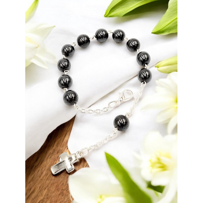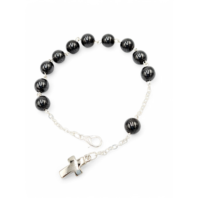Elegancka bransoletka o religijnym charakterze, wykonana z hematytu oraz metalowych elementów z motywem krzyża, wyposażona w praktyczne zapięcie typu karabińczyk. Stylowa biżuteria religijna do codziennego noszenia jako symbol wiary.