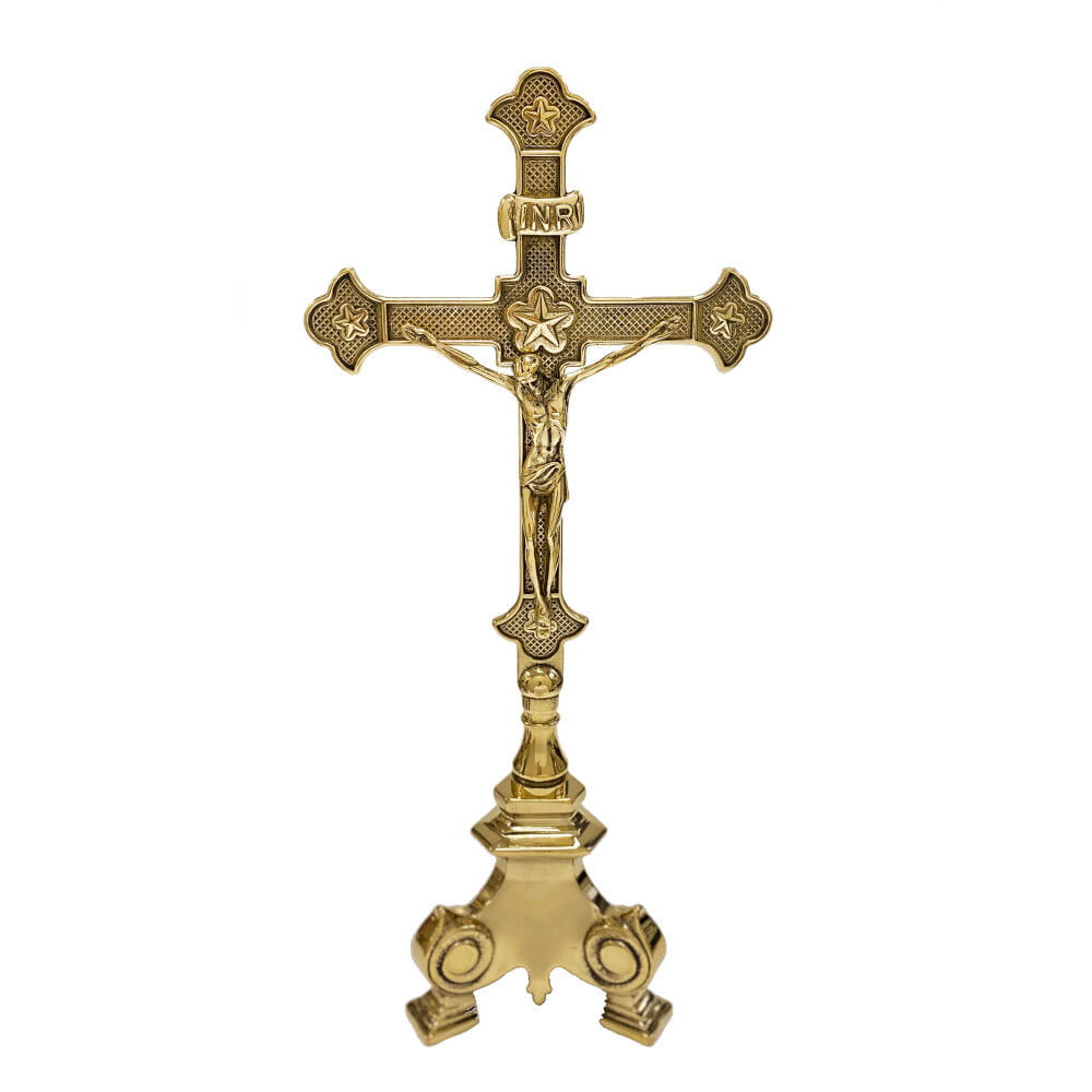Elegancki, dwustronny krzyż ołtarzowy wykonany z wysokiej jakości mosiądzu. Pasyjka umieszczona po obu stronach sprawia, że krzyż prezentuje się identycznie z każdej perspektywy. Starannie zdobione ramiona oraz stabilna podstawa nadają mu wyjątkowy charakter. Idealny do ustawienia na ołtarzu w kościołach i kaplicach – łączy piękno tradycyjnego wzornictwa z trwałością wykonania.