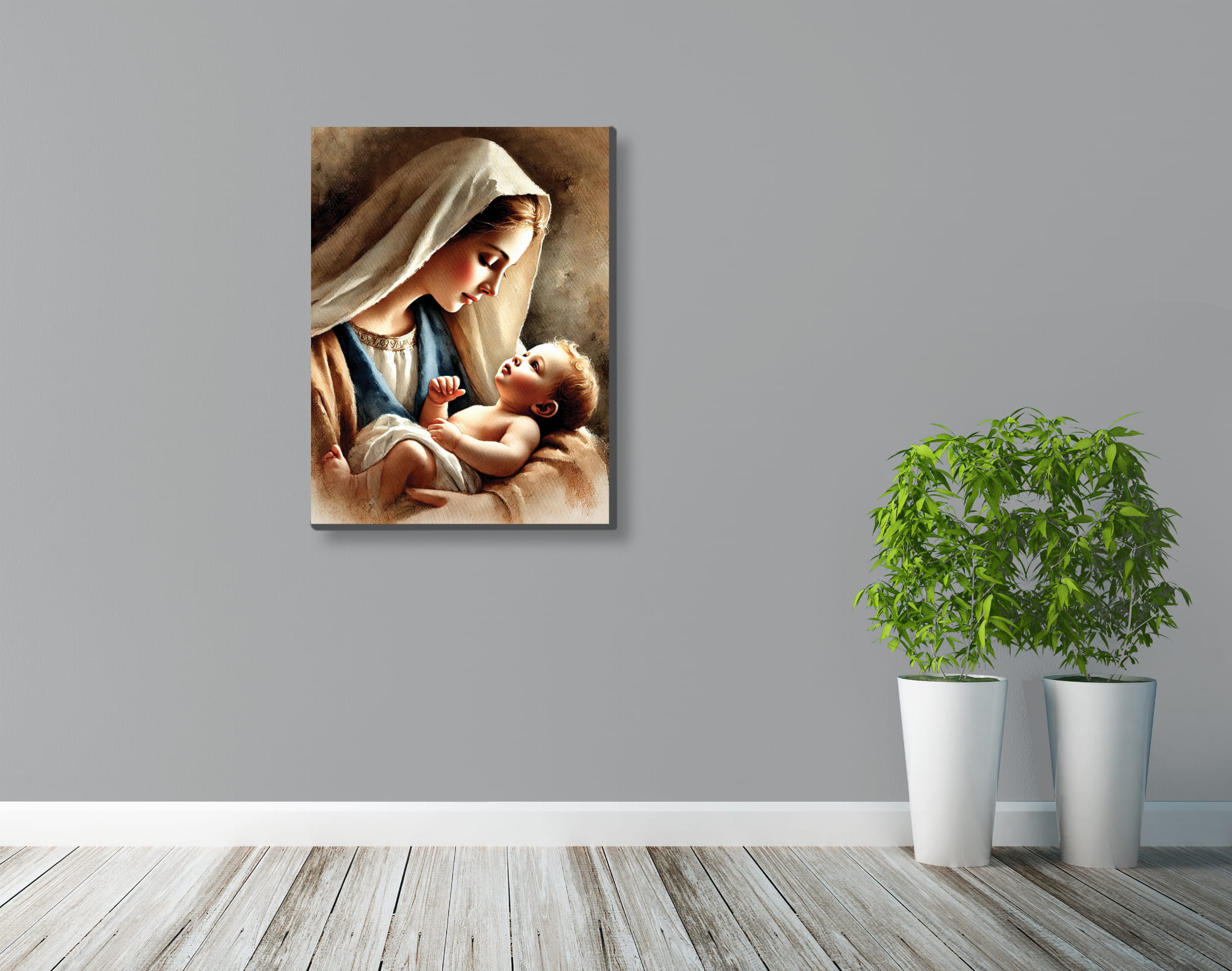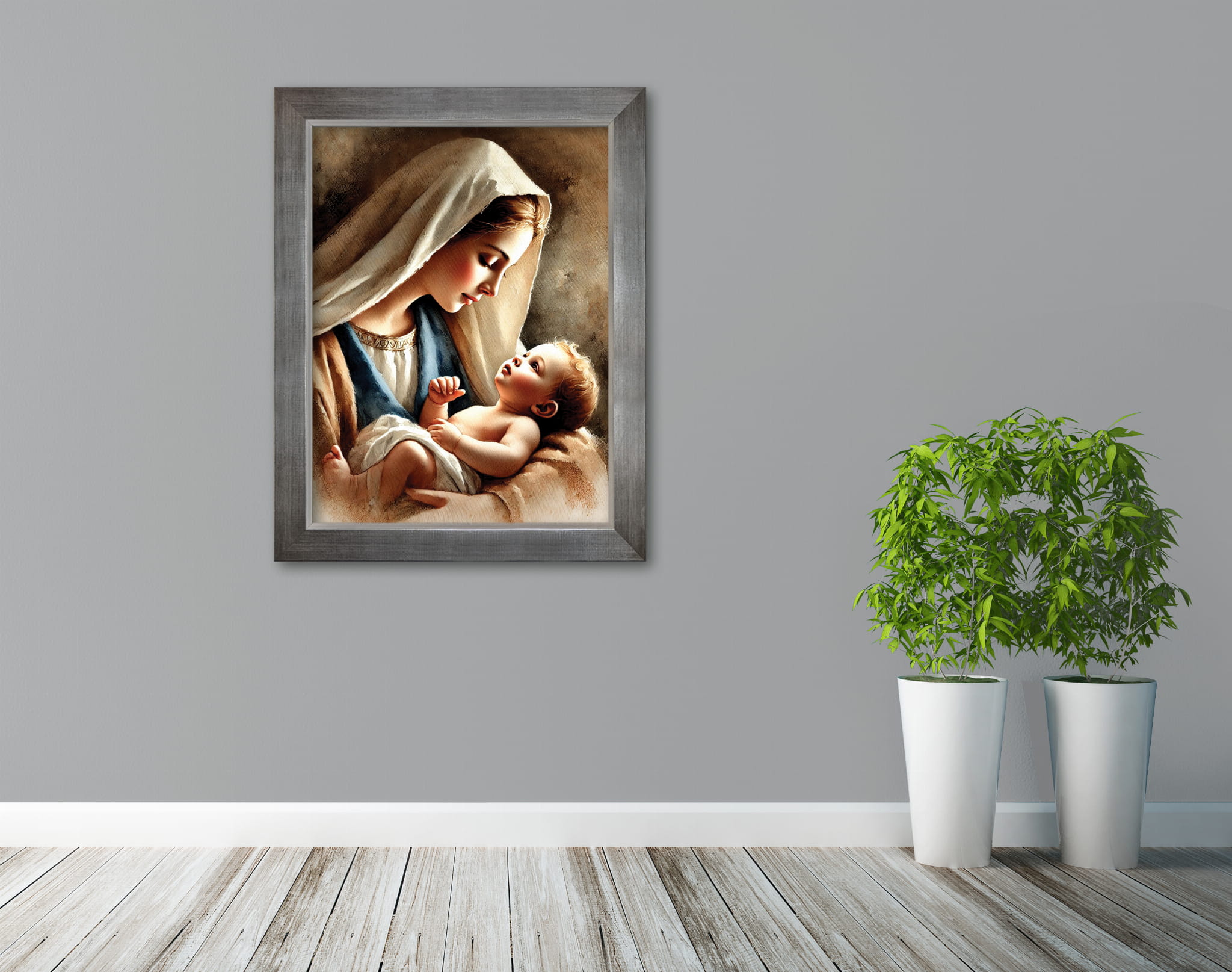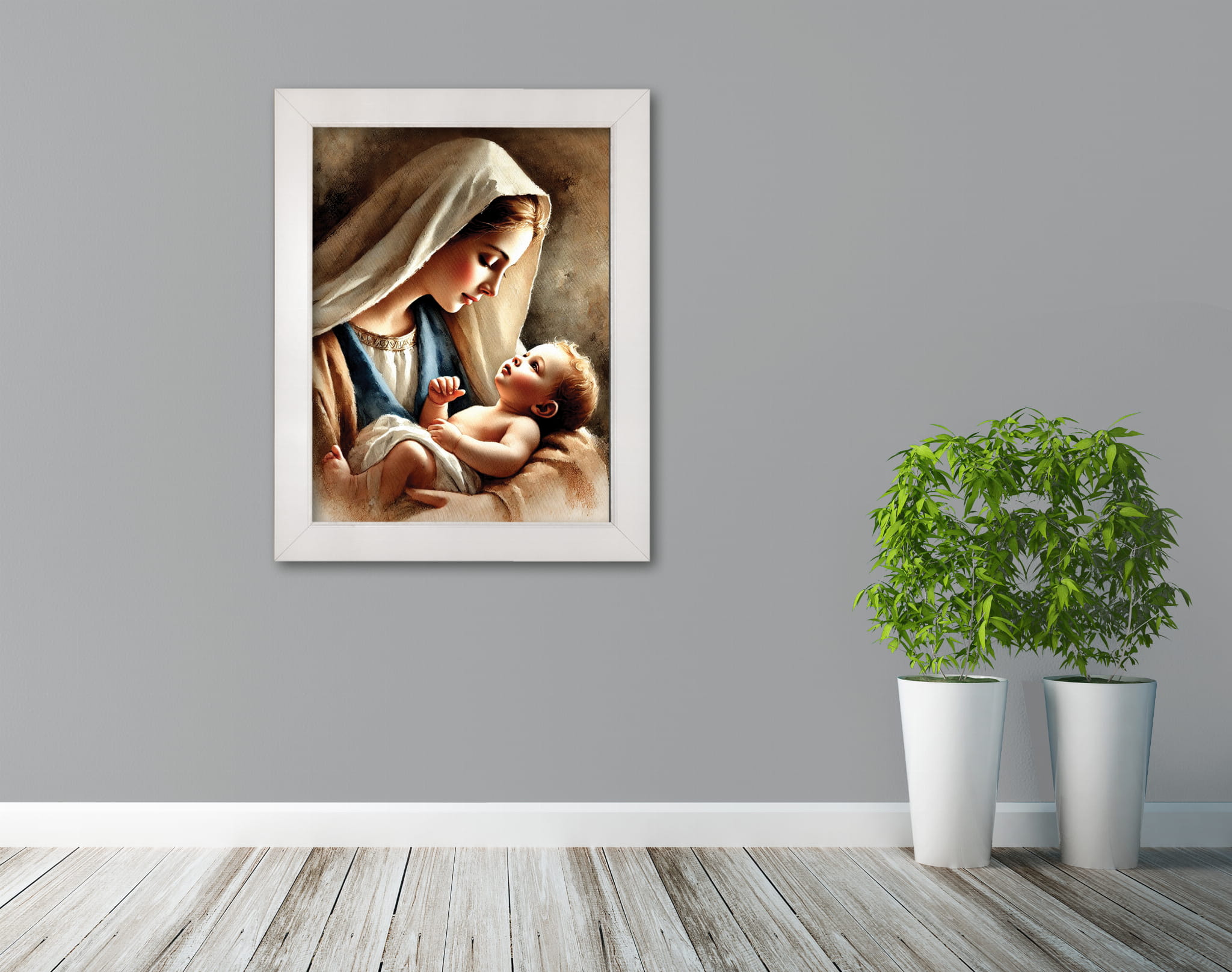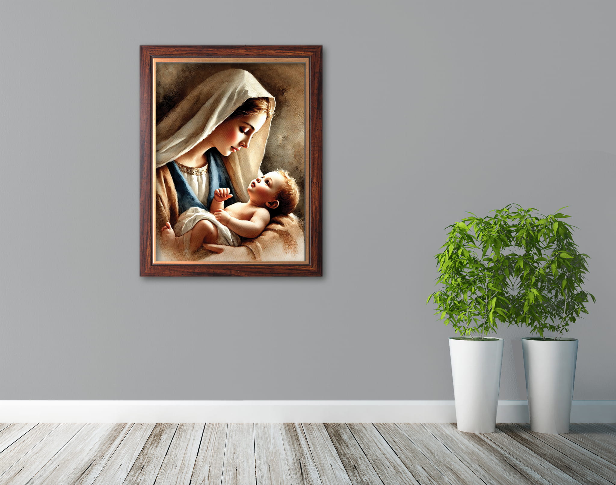 Obraz religijny na wysokiej jakości płótnie przedstawia wizerunek Matki Bożej z Dzieciątkiem Jezus.