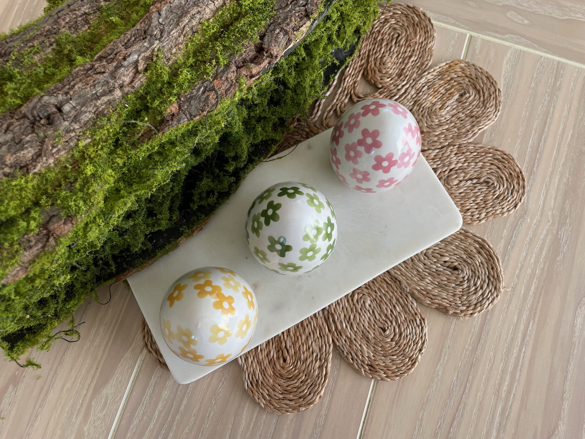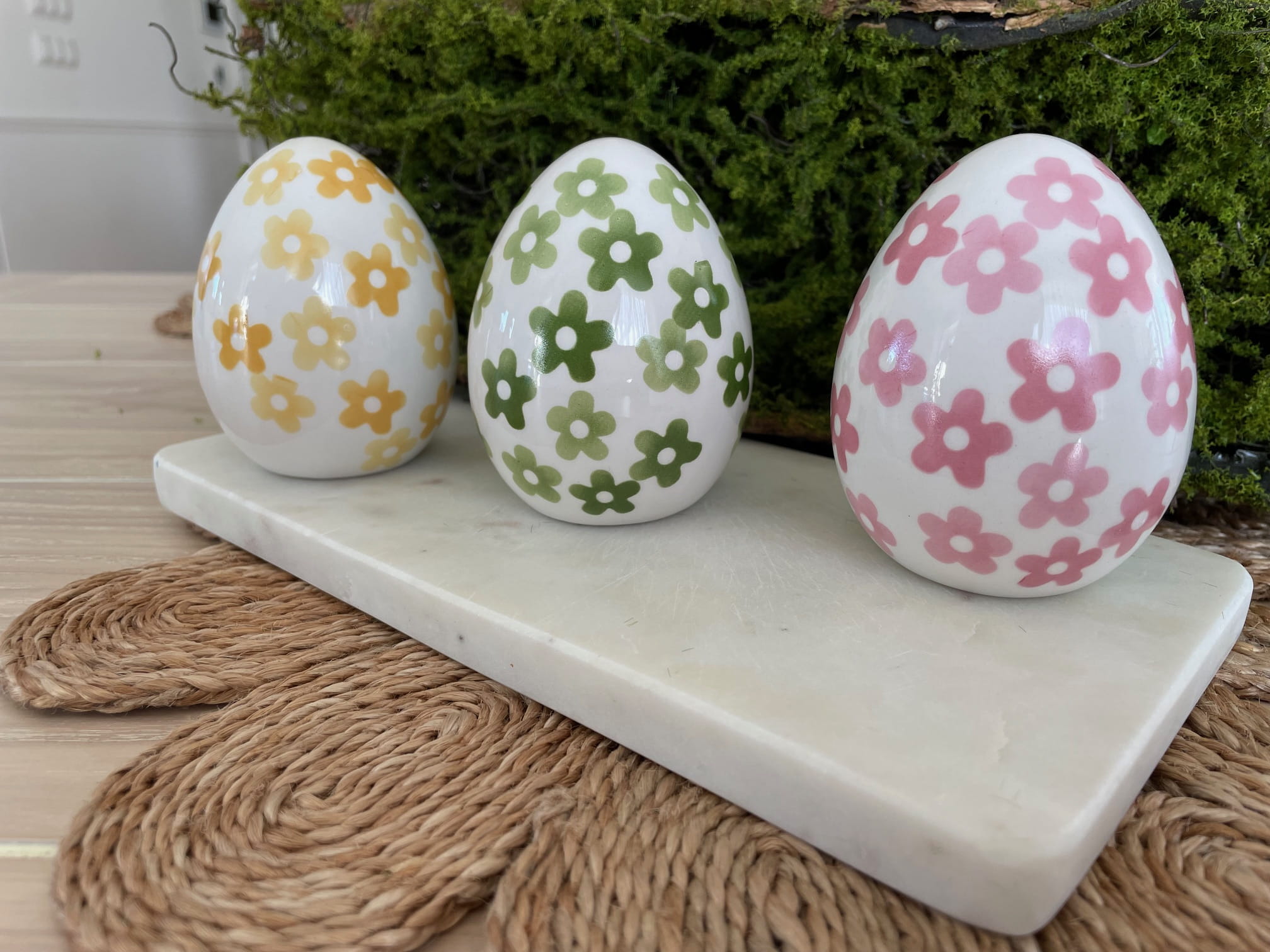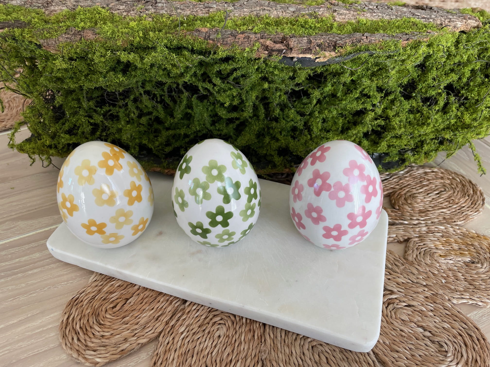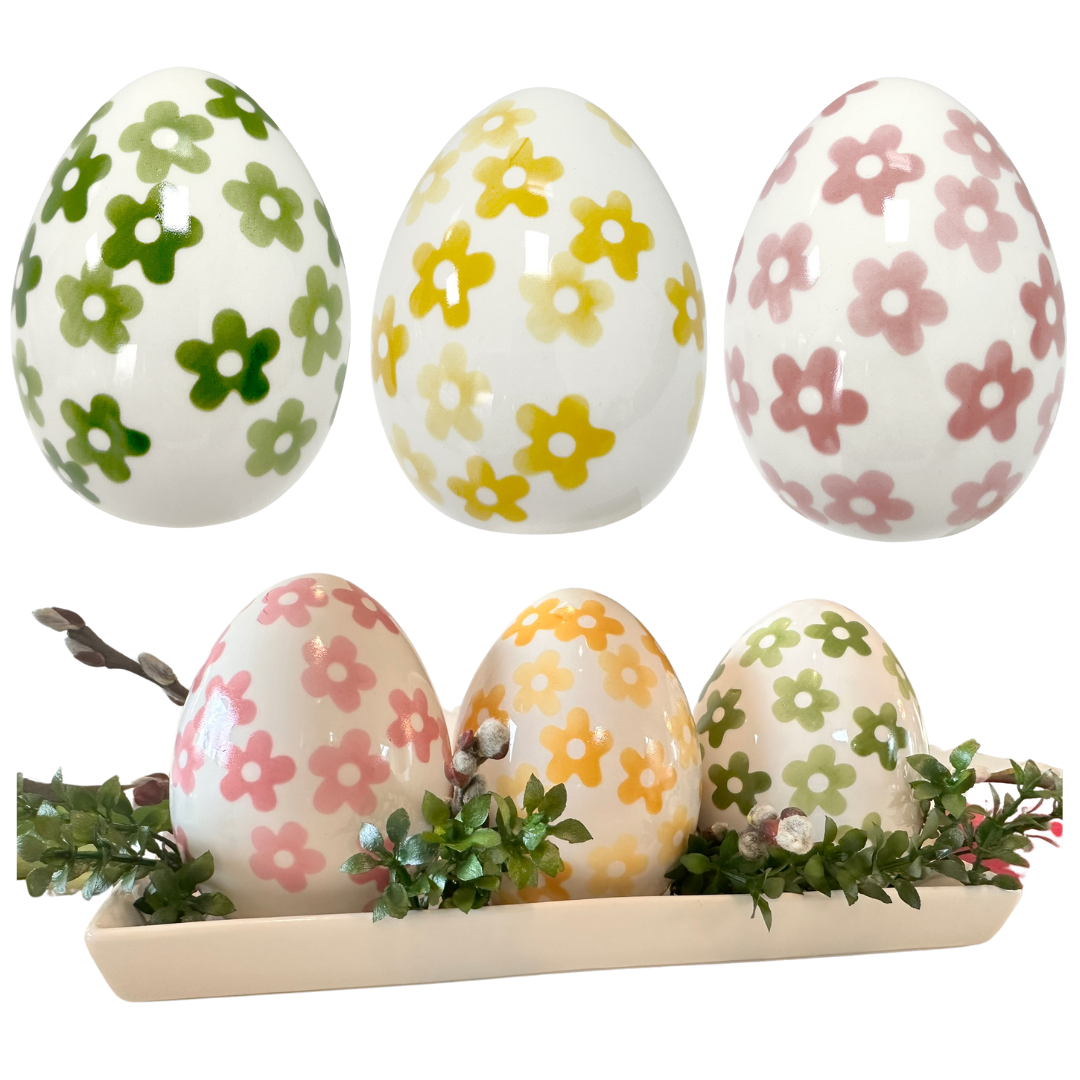 Wprowadź elegancję i wyjątkowy styl do swojego domu na Wielkanoc! Zestaw trzech porcelanowych jajek: różowego, żółtego i zielonego to doskonały wybór na świąteczną dekorację. Każde jajko jest ręcznie malowane, co nadaje mu unikalny, artystyczny charakter i sprawia, że stanowi piękną ozdobę na lata.