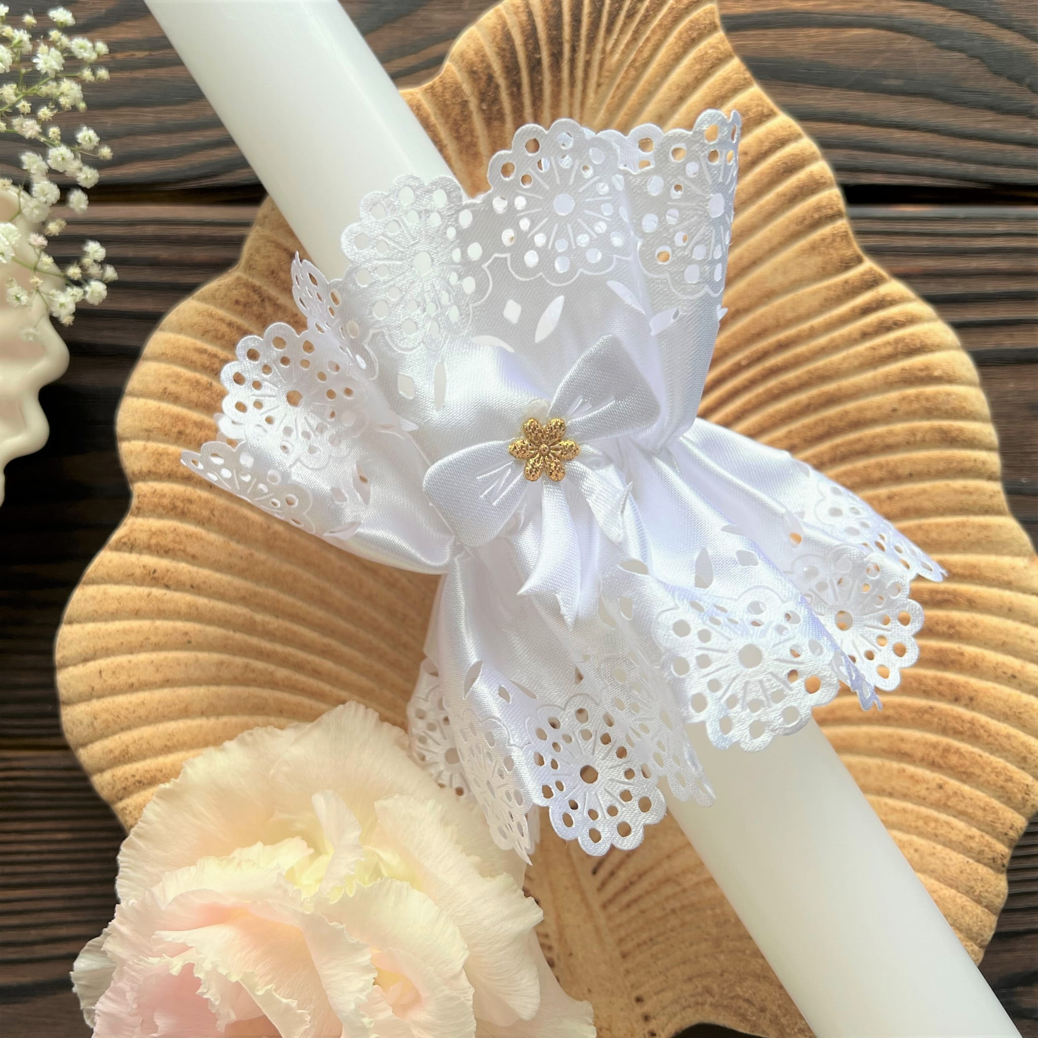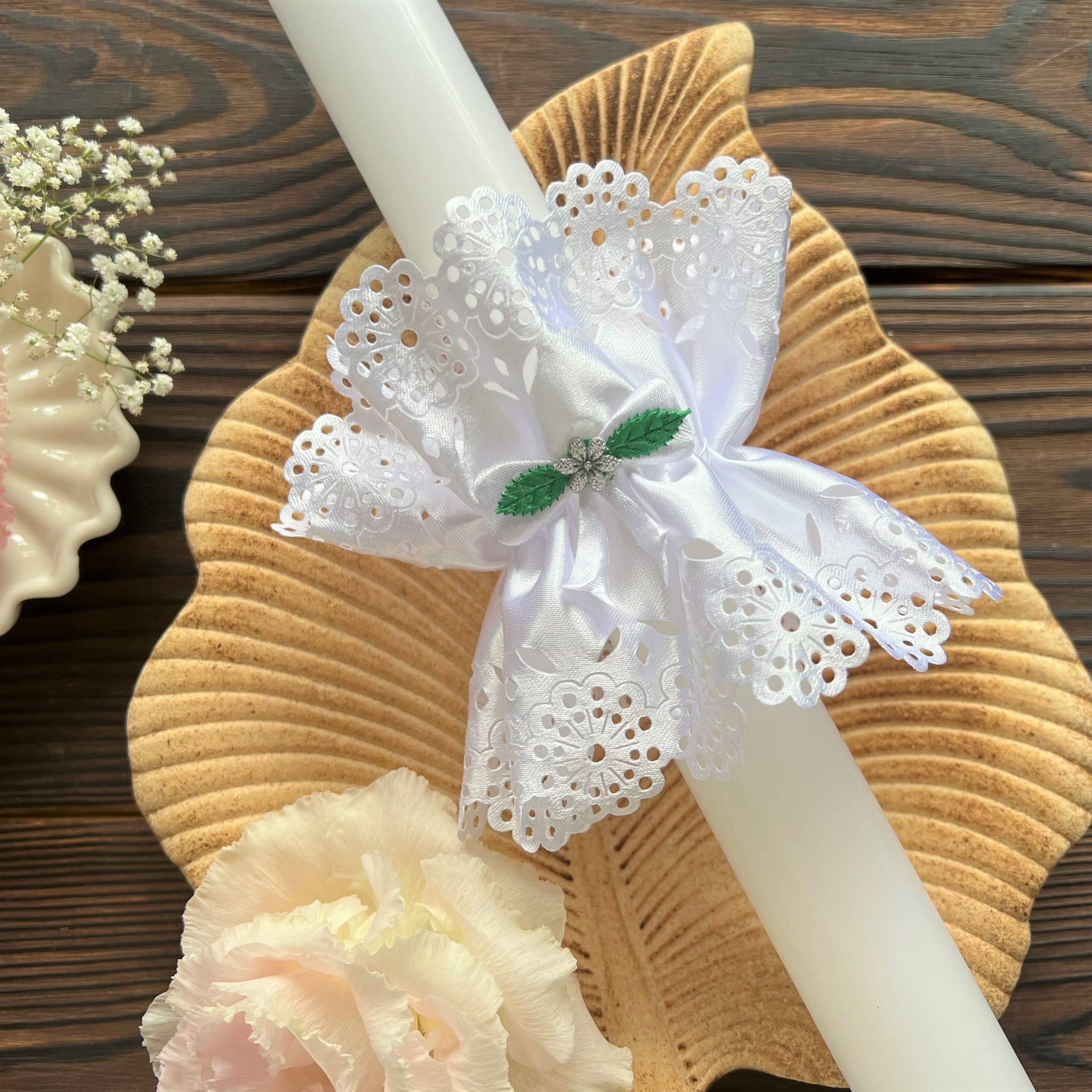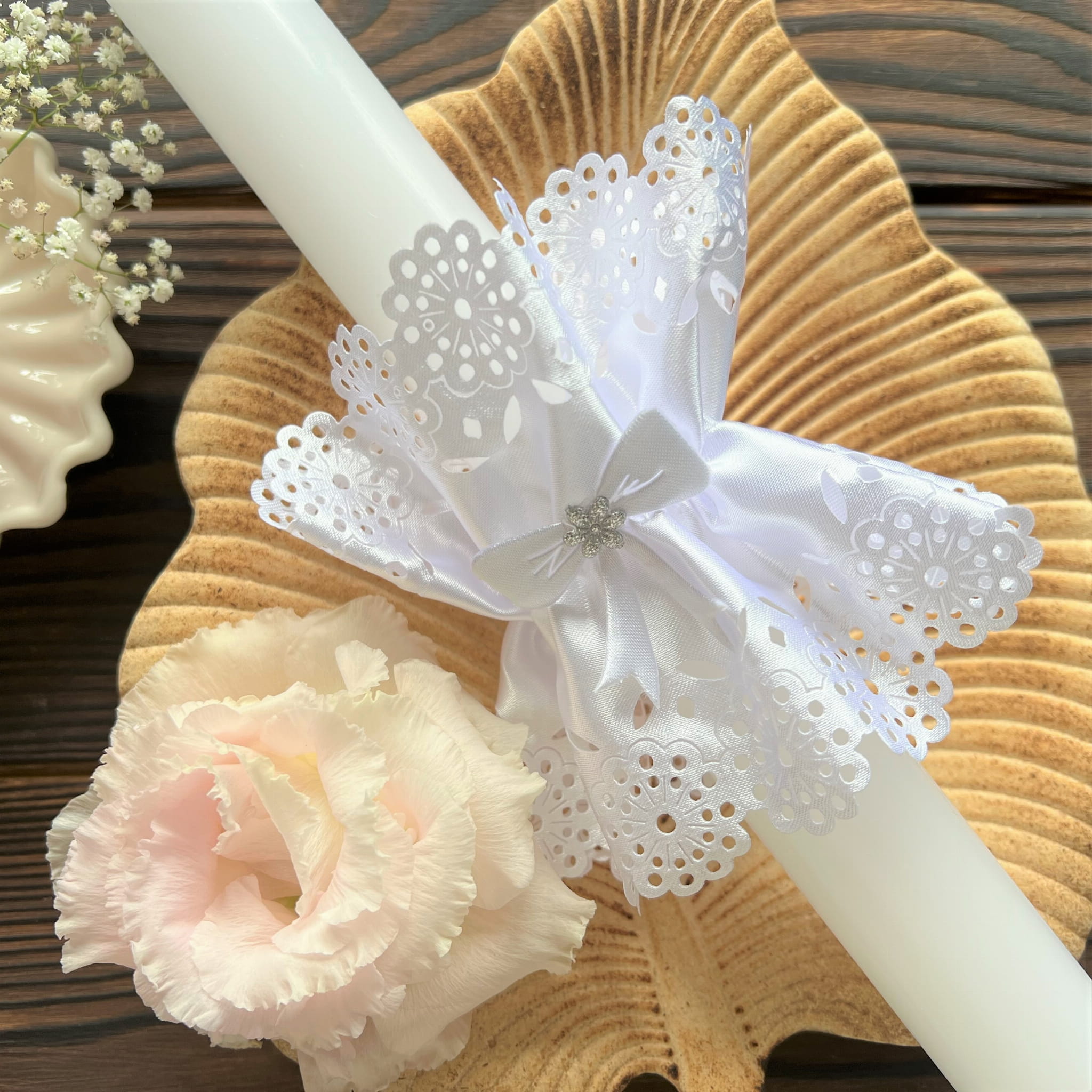Stroik do świecy to doskonała dekoracja na Chrzest Święty. Wykonana z atłasowego materiału, ozdobiona białą kokardą i uroczym kwiatuszkiem, nadaje świecy elegancki i subtelny wygląd. Delikatne aplikacje dostępne w trzech wariantach kolorystycznych: złotym, srebrnym i zielonym. Rozmiar idealnie dopasowany do świecy.