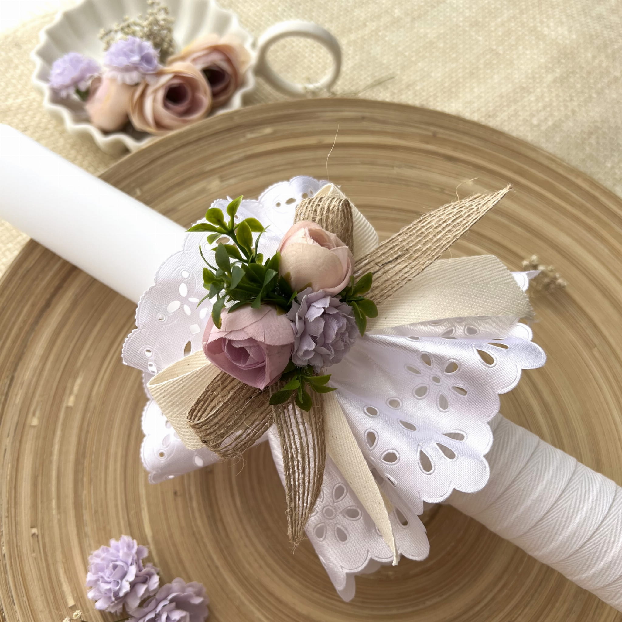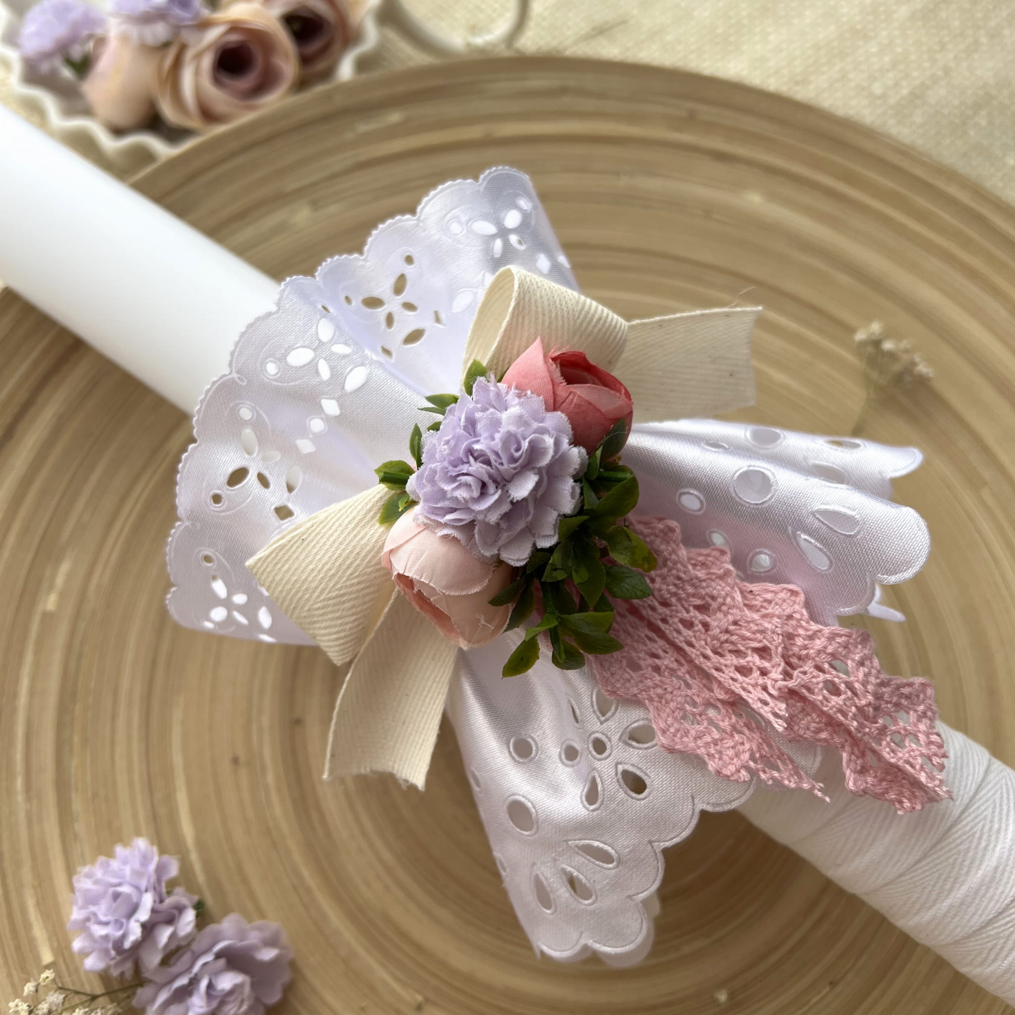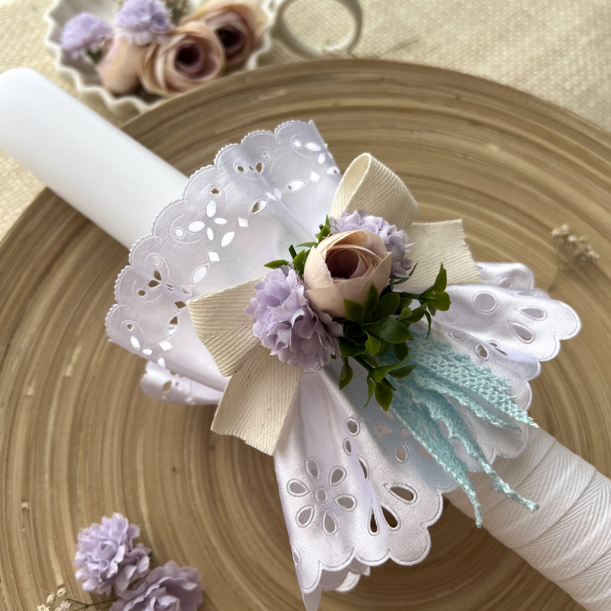 Dzięki delikatnym kwiatuszkom i atłasowej profitce, stroik dodaje elegancji i uroku świecy, podkreślając jednocześnie jej symboliczne znaczenie podczas ceremonii komunijnej. Ponadto, możliwość personalizacji stroika sprawia, że może on stać się nie tylko doskonałym prezentem komunijnym, ale także pamiątką na wiele lat. Dla chłopców dostępna jest niebieska koronka, podkreślająca ich delikatną elegancję, natomiast dla dziewczynek różowa koronka dodaje subtelności.