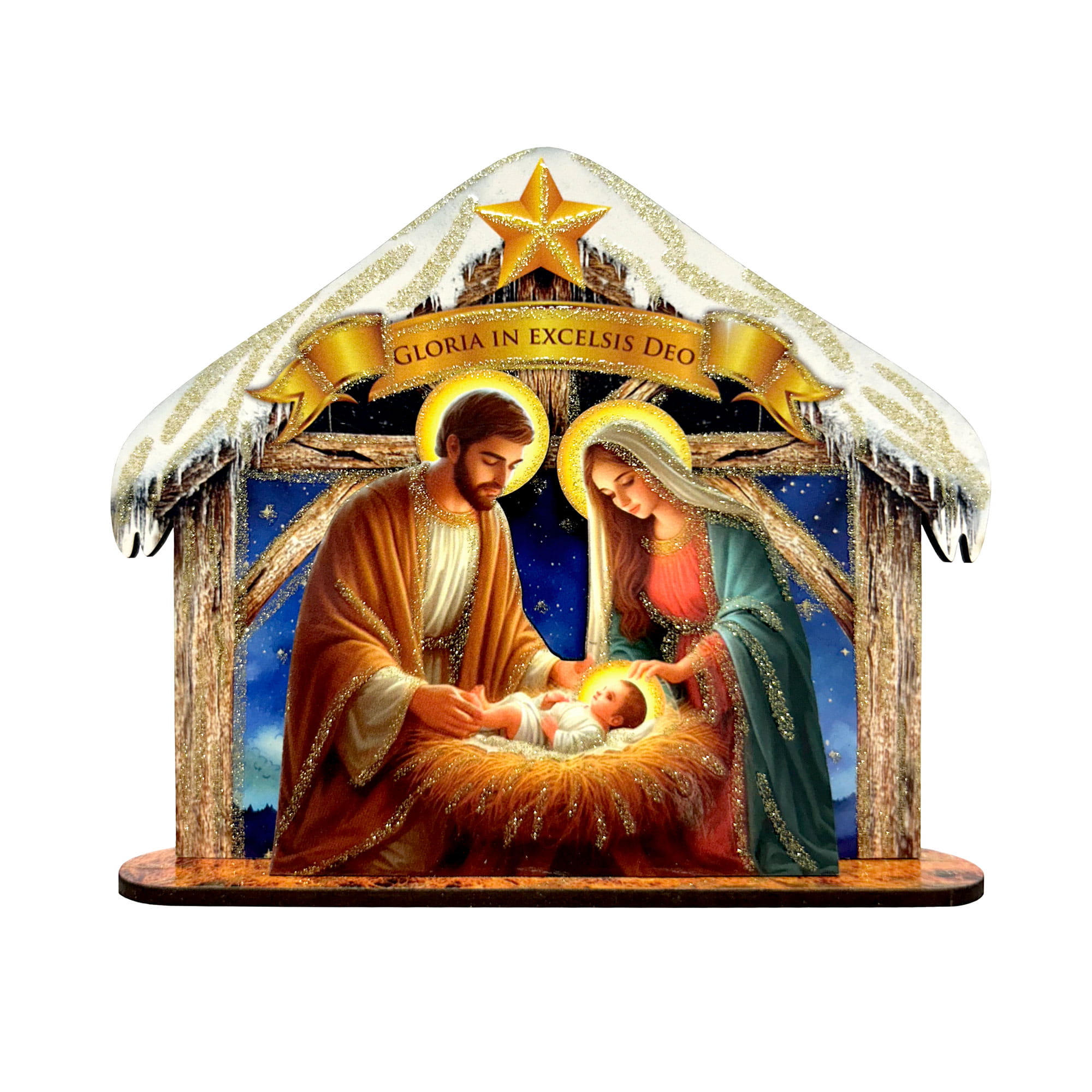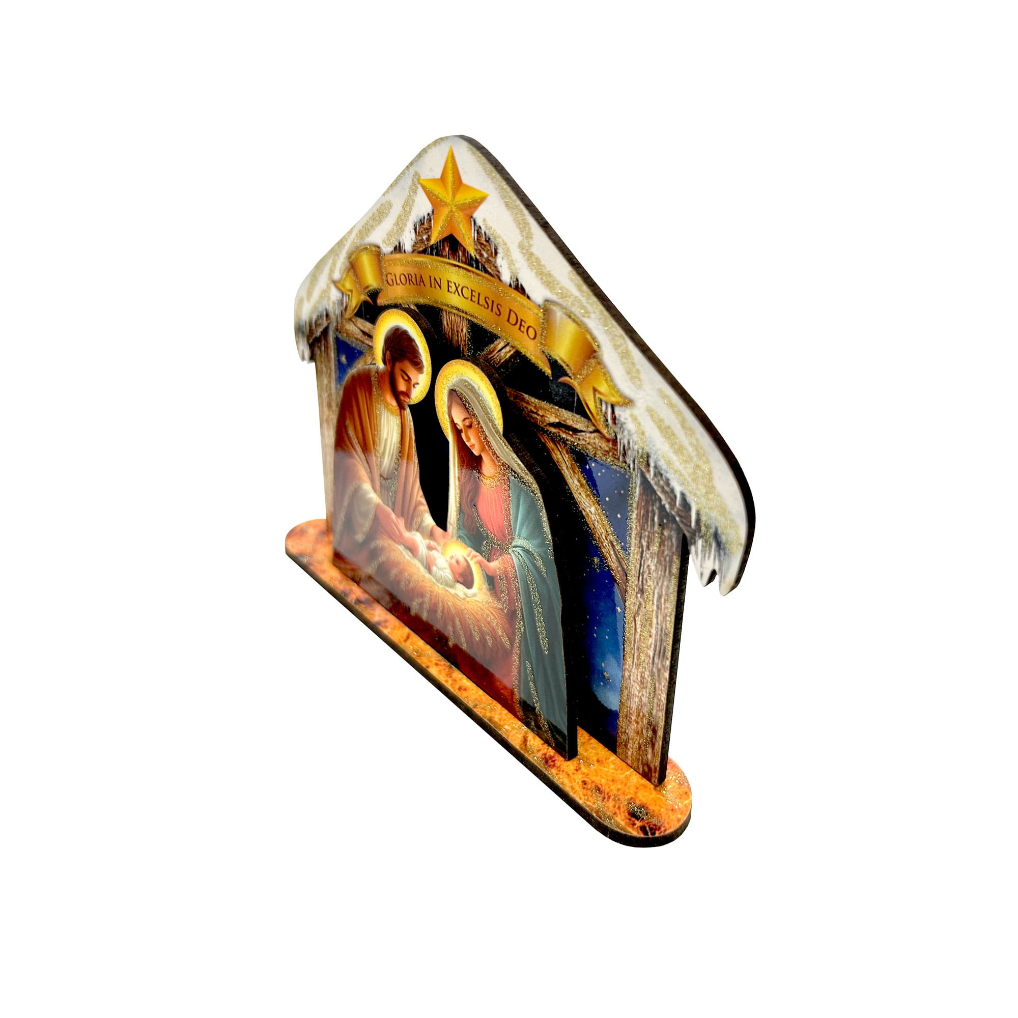 Szopka składa się z trzech elementów, które po złożeniu tworzą przestrzenną dekorację z wizerunkiem Świętej Rodziny w stajence betlejemskiej. Nadruk jest wyrazisty i trwały, wzbogacony o złote akcenty i napisy „Gloria in Excelsis Deo”.